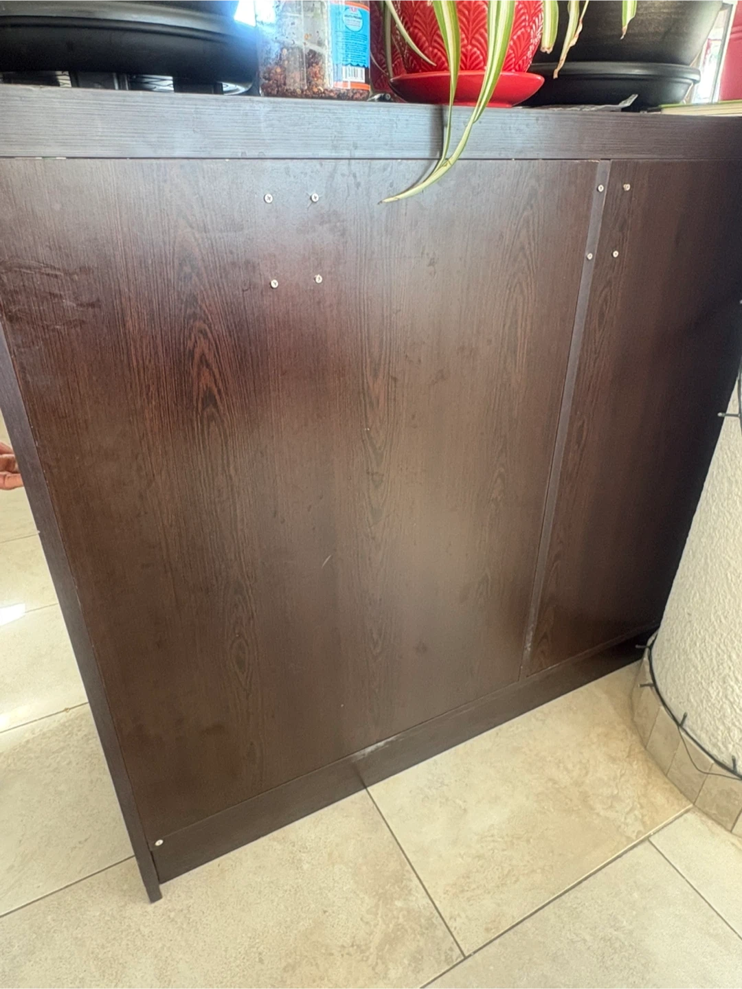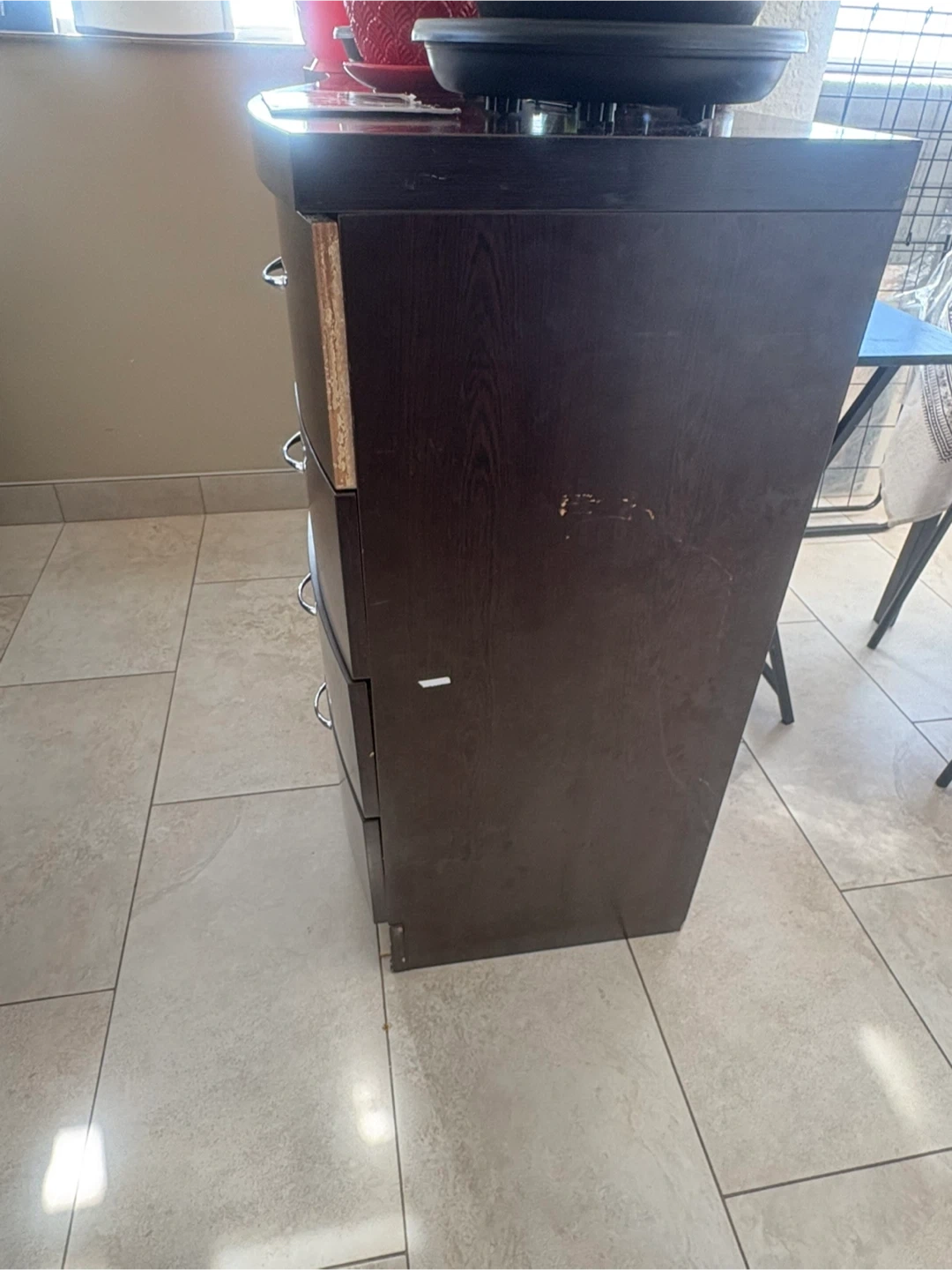 A dark brown dresser with six drawers for storage. It's made of a wood-like material with silver handles. This dresser is great for organizing clothes or linens.