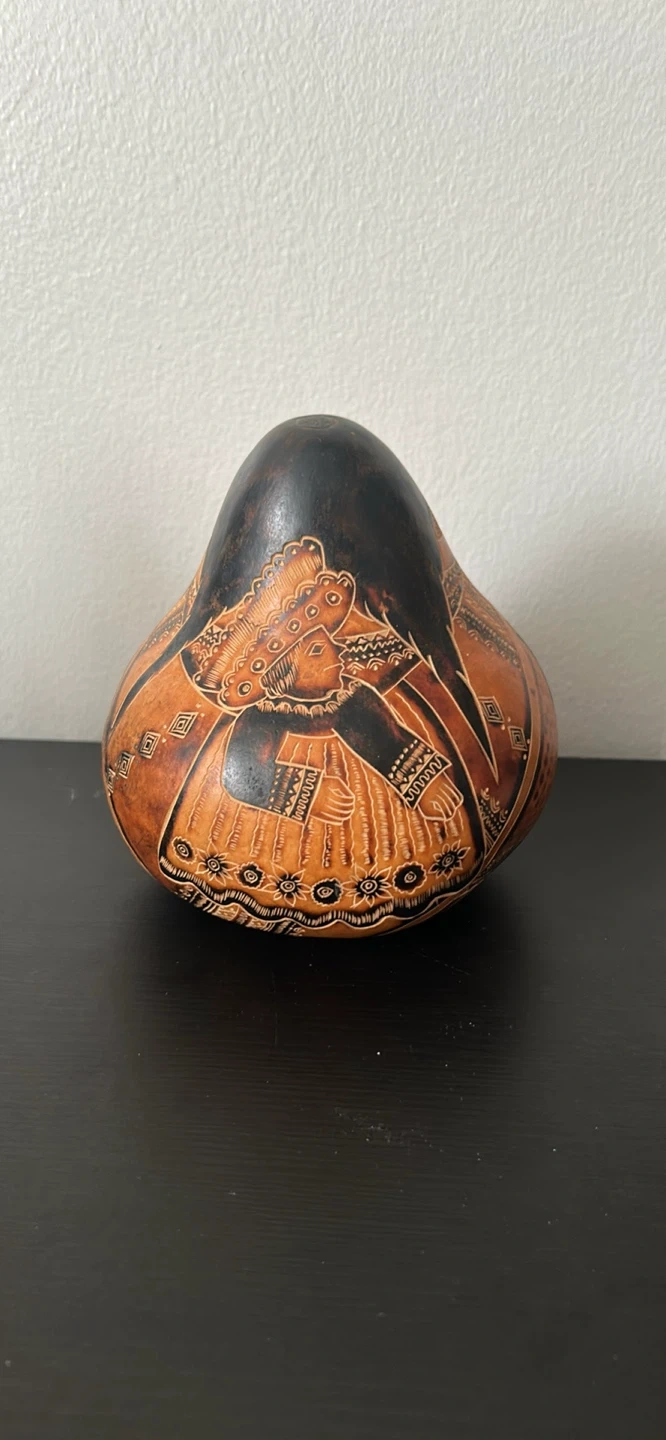 This is a unique decorative gourd, handcrafted with intricate etched designs. The earthy tones and detailed patterns give it a distinct artisanal feel. It's a lovely piece for home decor or as a conversation starter!