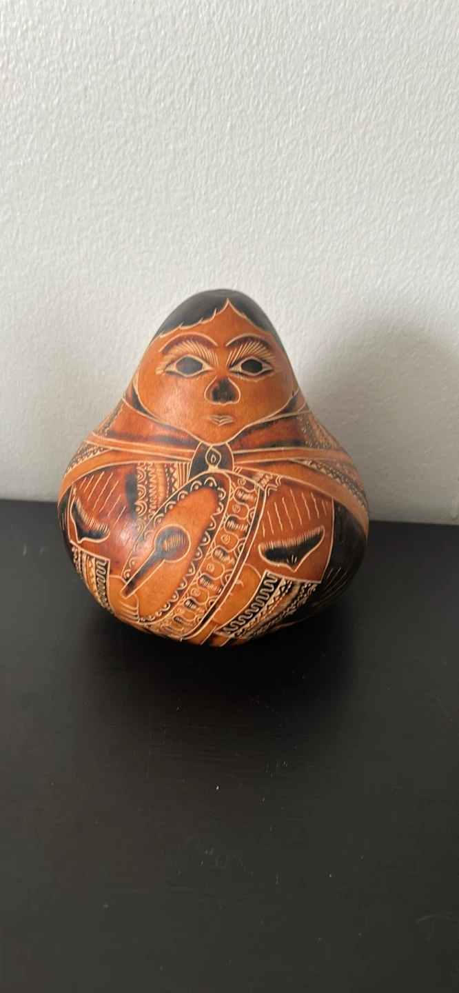 This is a unique decorative gourd, handcrafted with intricate etched designs. The earthy tones and detailed patterns give it a distinct artisanal feel. It's a lovely piece for home decor or as a conversation starter!