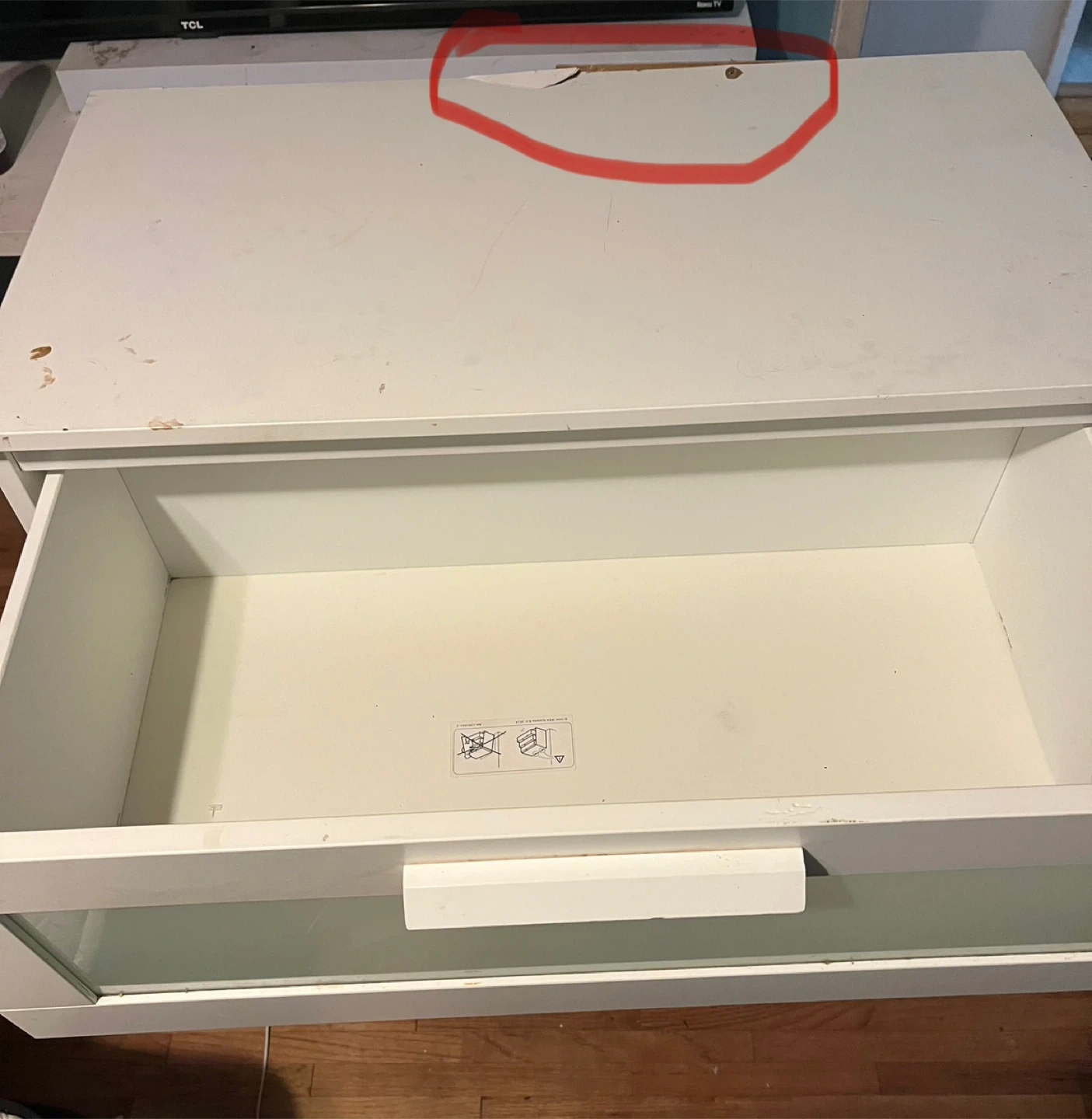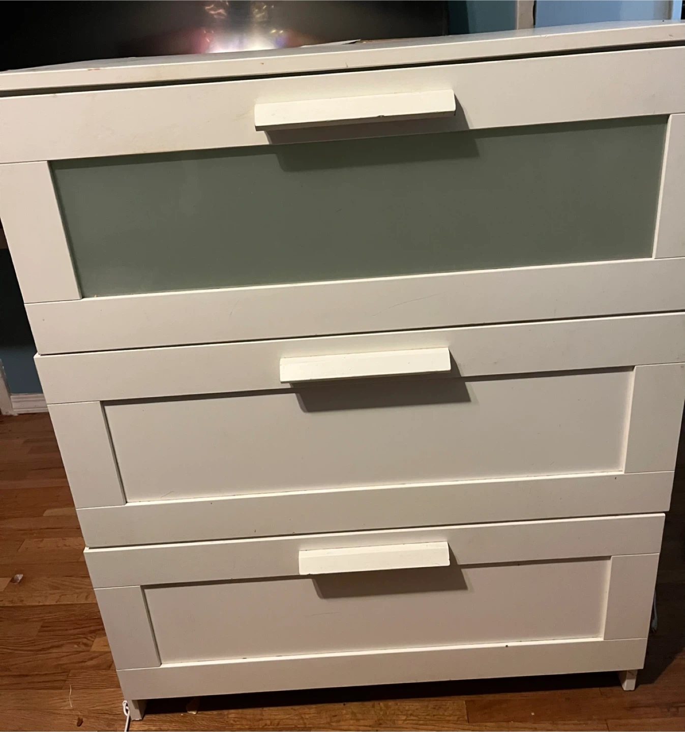 White 3-drawer chest with frosted glass drawer fronts. Some wear and tear on the top surface. Plenty of storage space for your bedroom or living area.