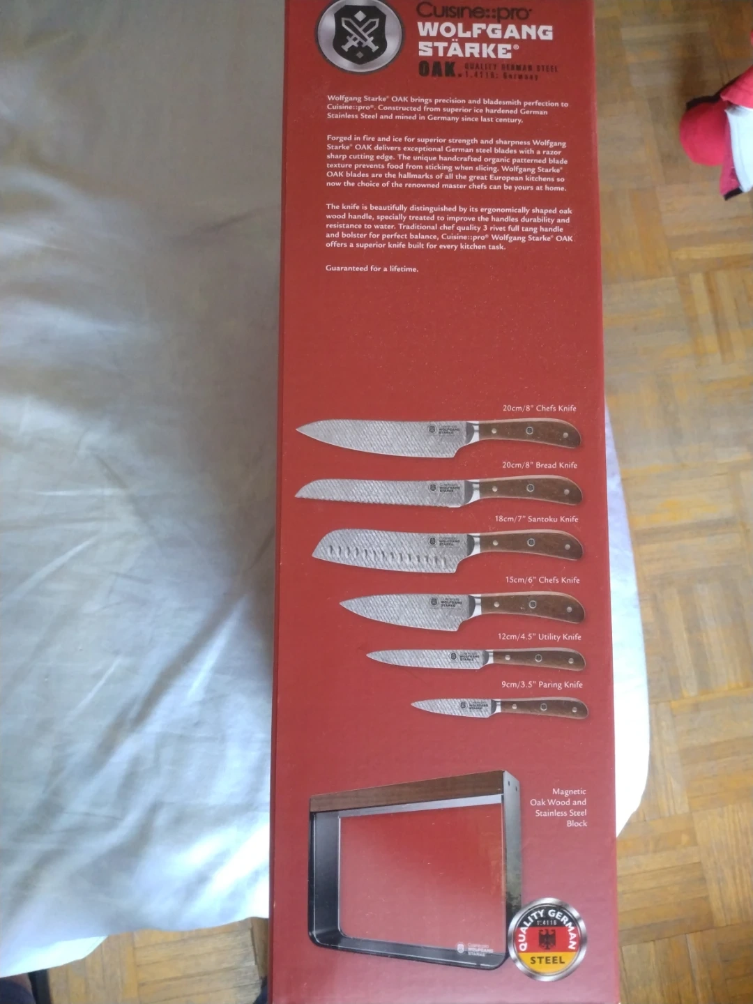 This Cuisine::Pro Wolfgang Starke Oak 7 Piece Knife Block Set includes precision German steel blades and oak wood handles. It's forged in fire and ice for superior strength and sharpness. Includes a magnetic oak wood and stainless steel block.