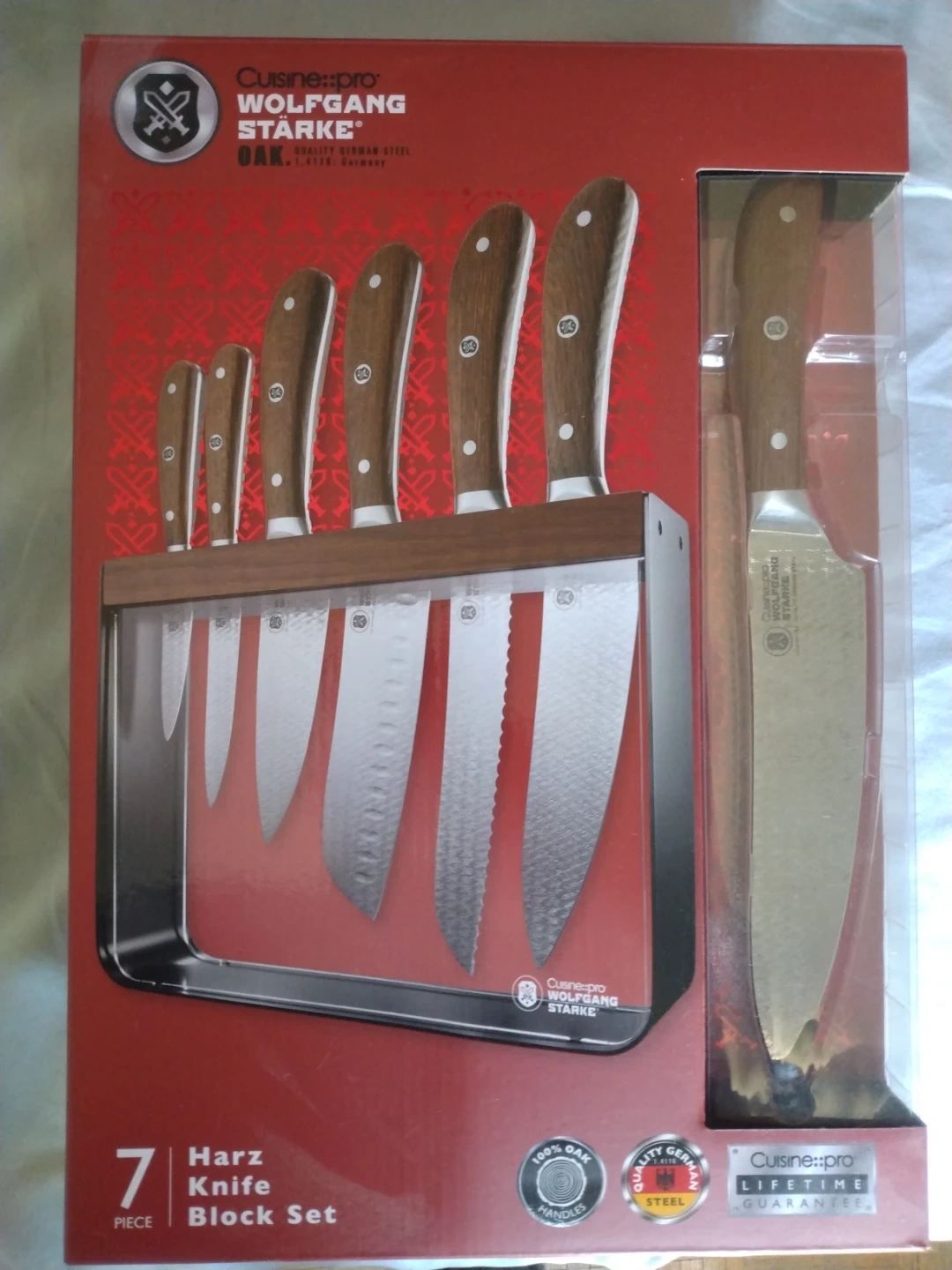 This Cuisine::Pro Wolfgang Starke Oak 7 Piece Knife Block Set includes precision German steel blades and oak wood handles. It's forged in fire and ice for superior strength and sharpness. Includes a magnetic oak wood and stainless steel block.