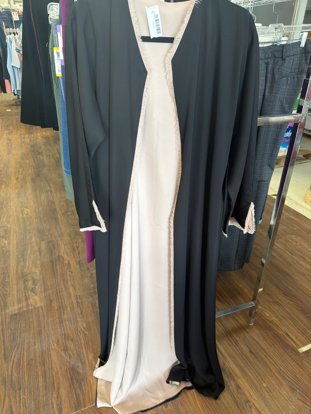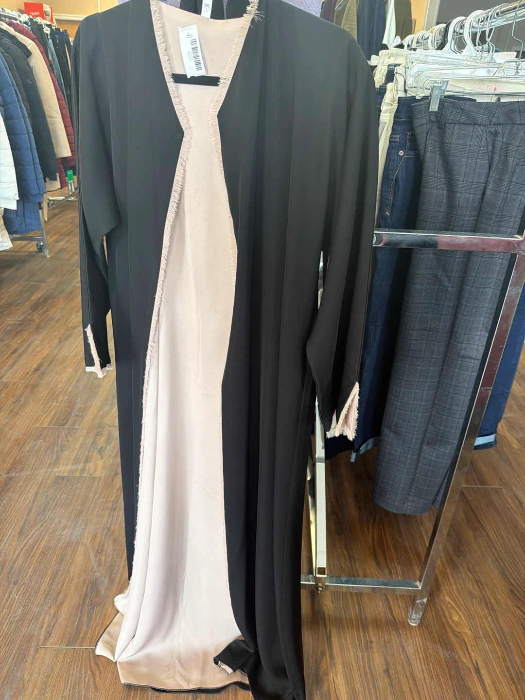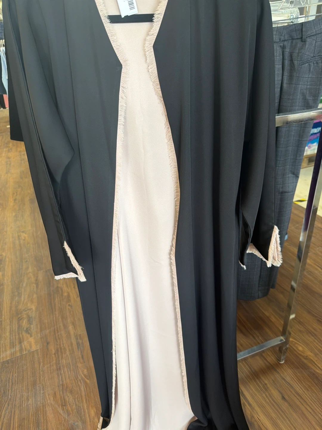 This black abaya features a contrasting beige lining and frayed edges for a unique look. It's a stylish and modest outerwear option for any occasion. Size 56 available it’s reversible wear abaya very nice fluey fabric . Made in UAE