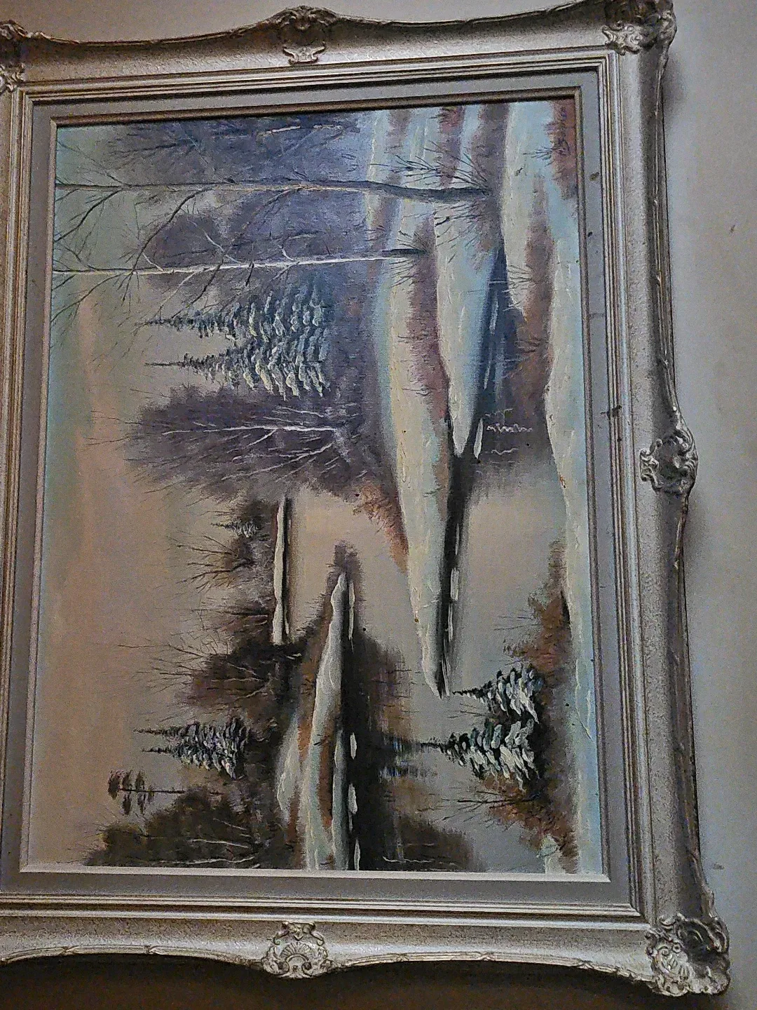 This painting depicts a serene winter landscape with snow-covered trees and ice formations. It's framed in an ornate, silver-toned frame. The artwork captures the quiet beauty of a frozen natural scene.