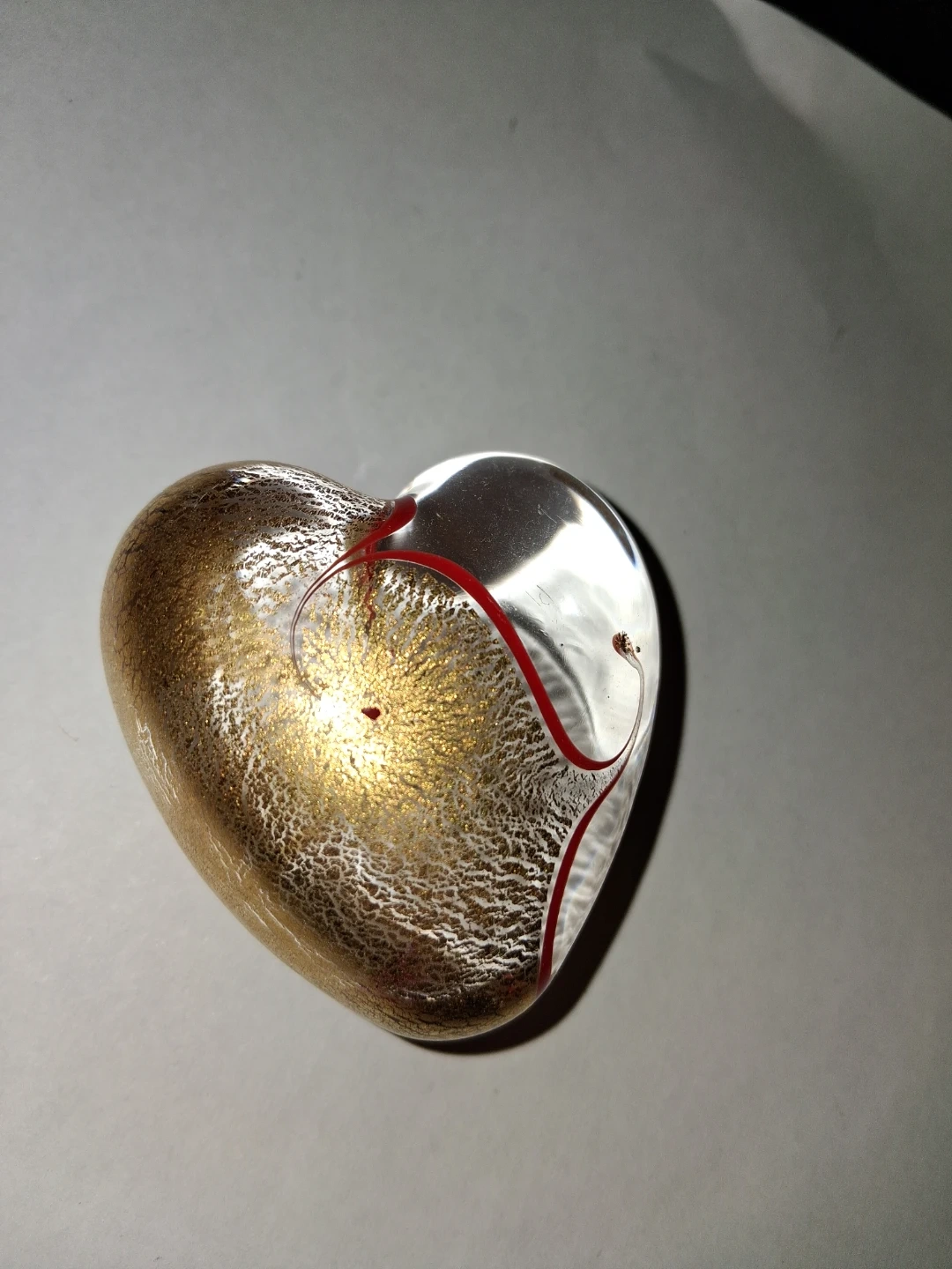A beautiful heart-shaped art glass sculpture by Robert Held. It's handmade in Canada and features a clear glass exterior with intricate gold swirls and red accents inside. This piece would make a lovely decorative accent. Amazing art heart here.