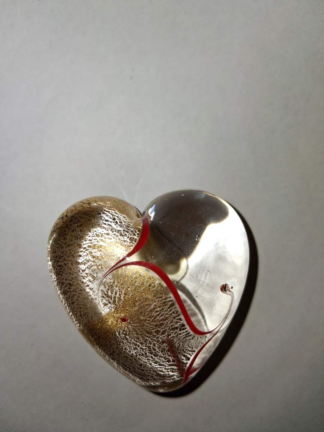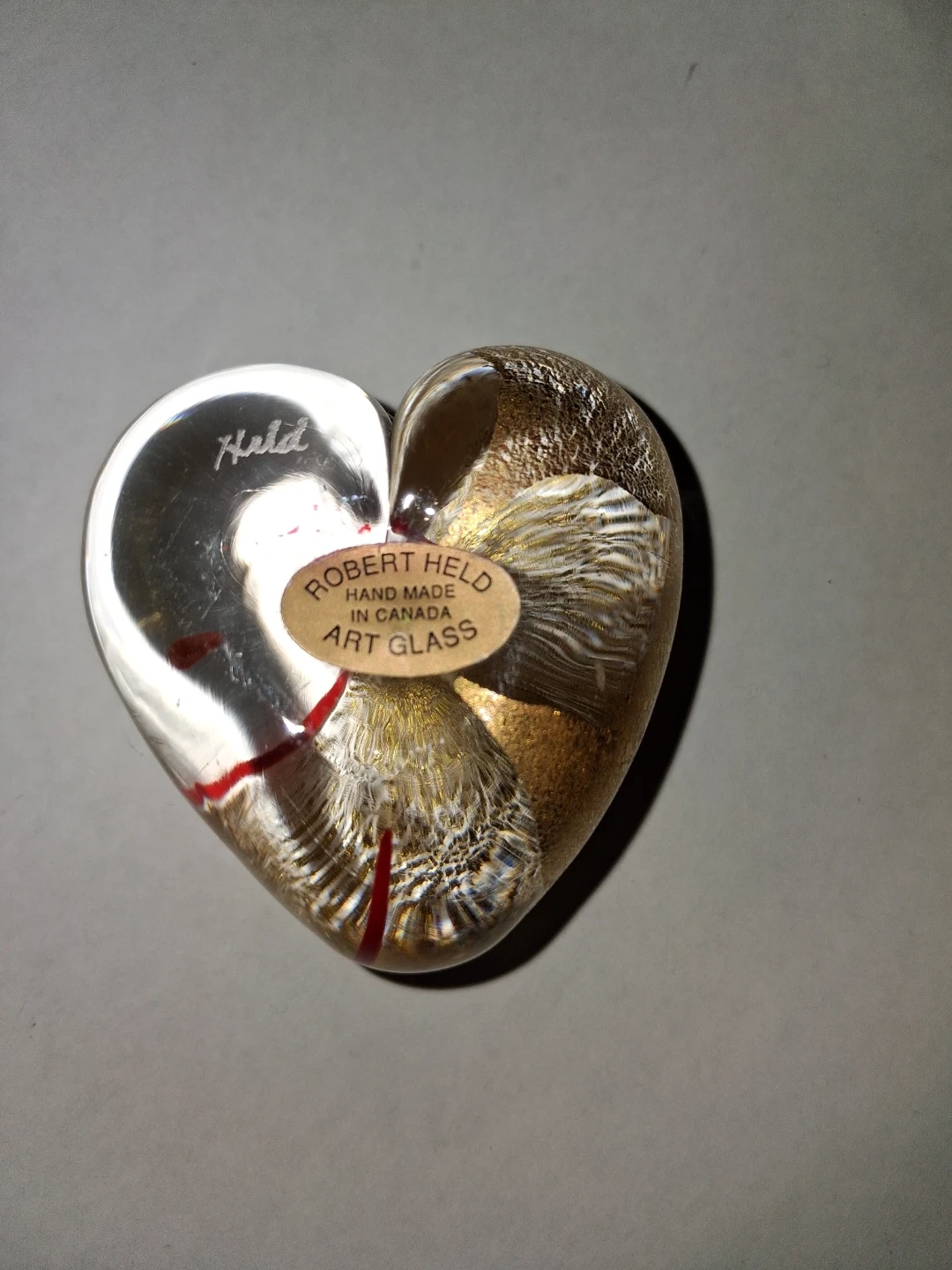 A beautiful heart-shaped art glass sculpture by Robert Held. It's handmade in Canada and features a clear glass exterior with intricate gold swirls and red accents inside. This piece would make a lovely decorative accent. Amazing art heart here.