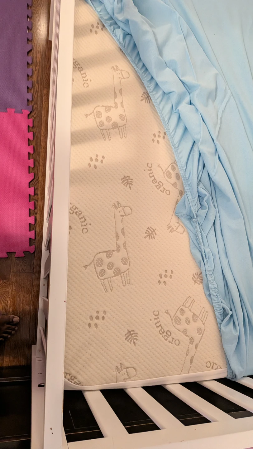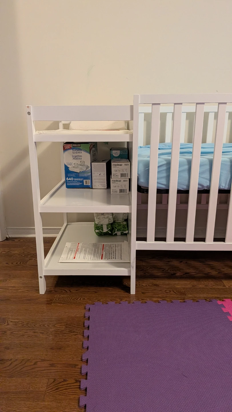 White convertible crib that includes a built-in changing station with shelves. Mattress and crib bedding are included. Suitable for a nursery.