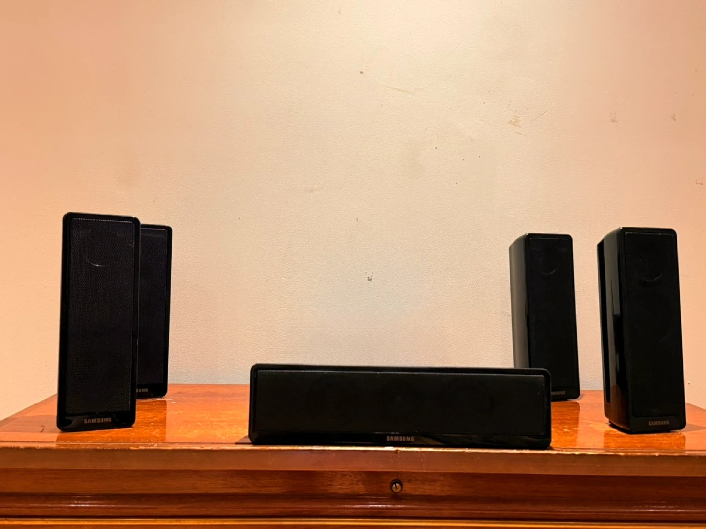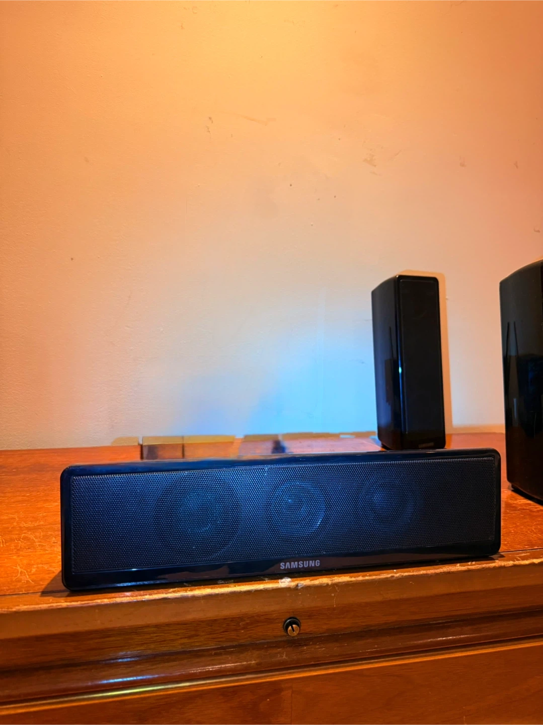 Selling a Samsung home theatre speaker system! It includes multiple speakers and a central sound bar, perfect for creating a surround sound experience in your living room. They're in great condition and ready to enhance your movie nights!