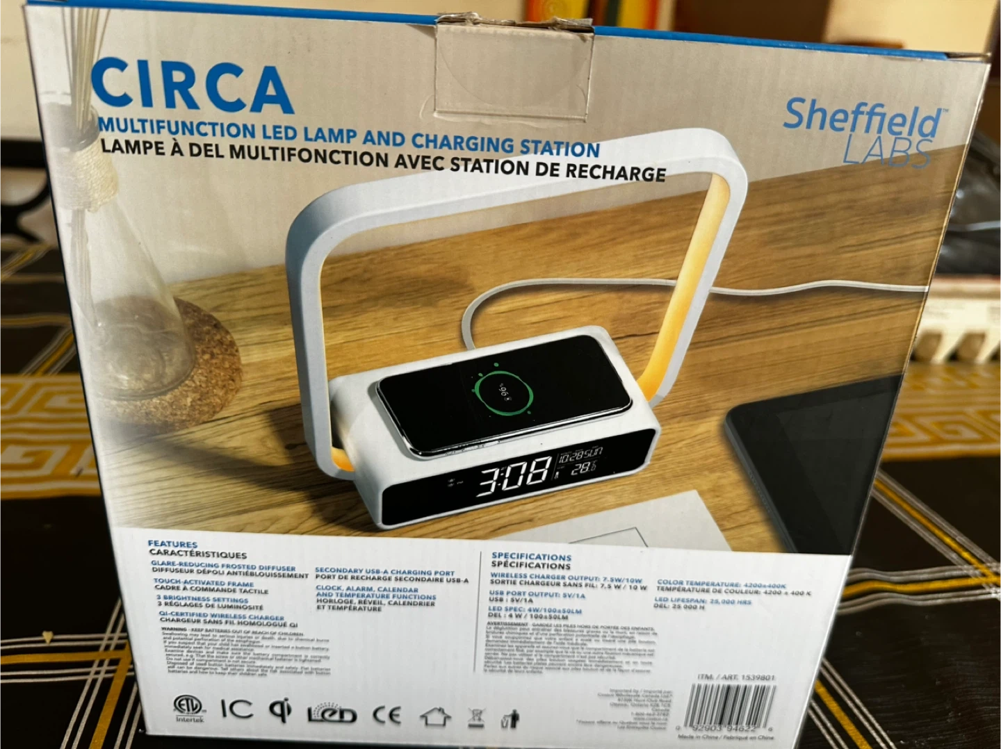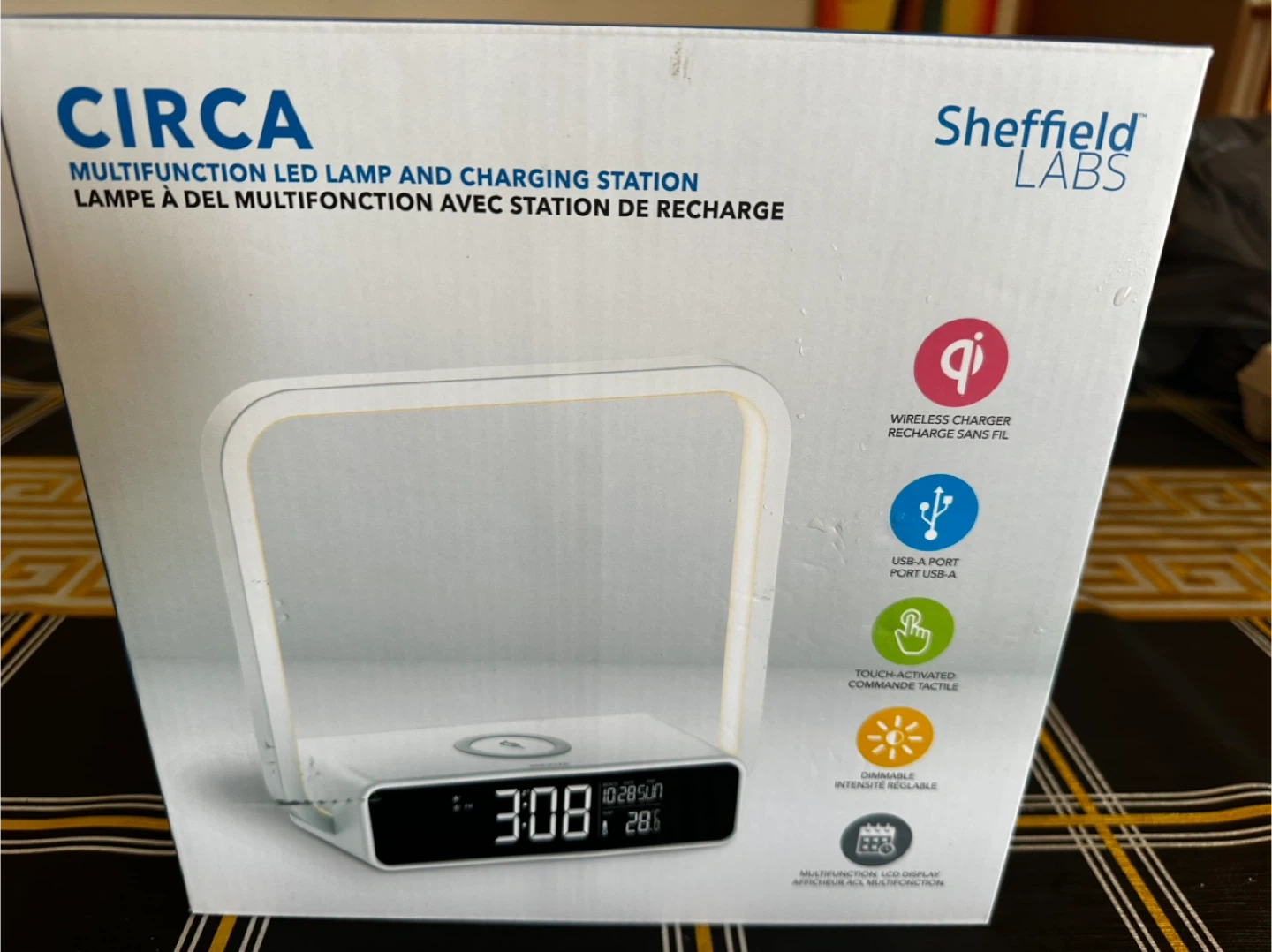 Like new Sheffield Labs CIRCA multifunction LED desk lamp with built-in wireless phone charging and digital clock display.