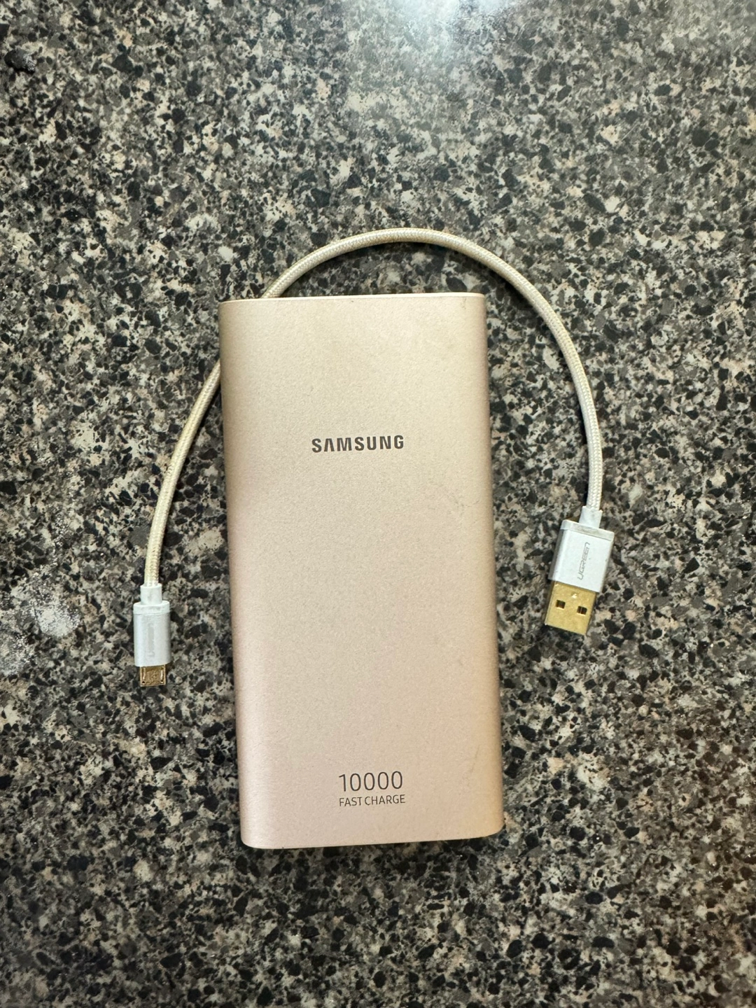 Gold portable charger. Includes cable. 10000 mAh capacity. Fast charge. Hardly use in travel2-3 times. No more needed.