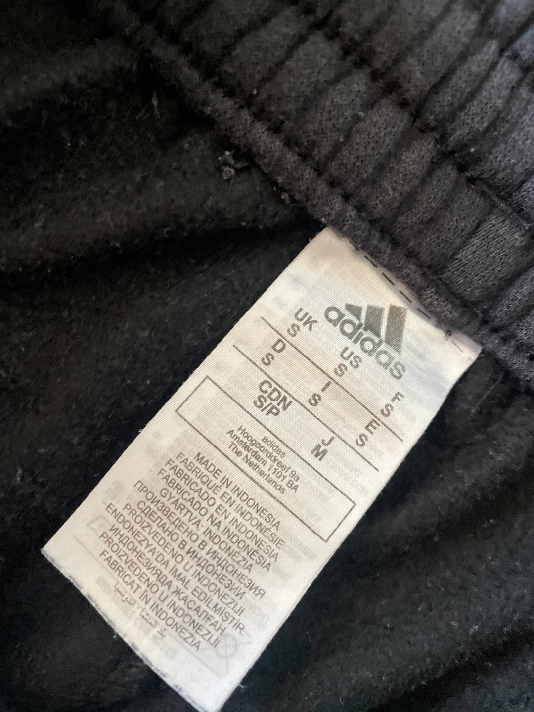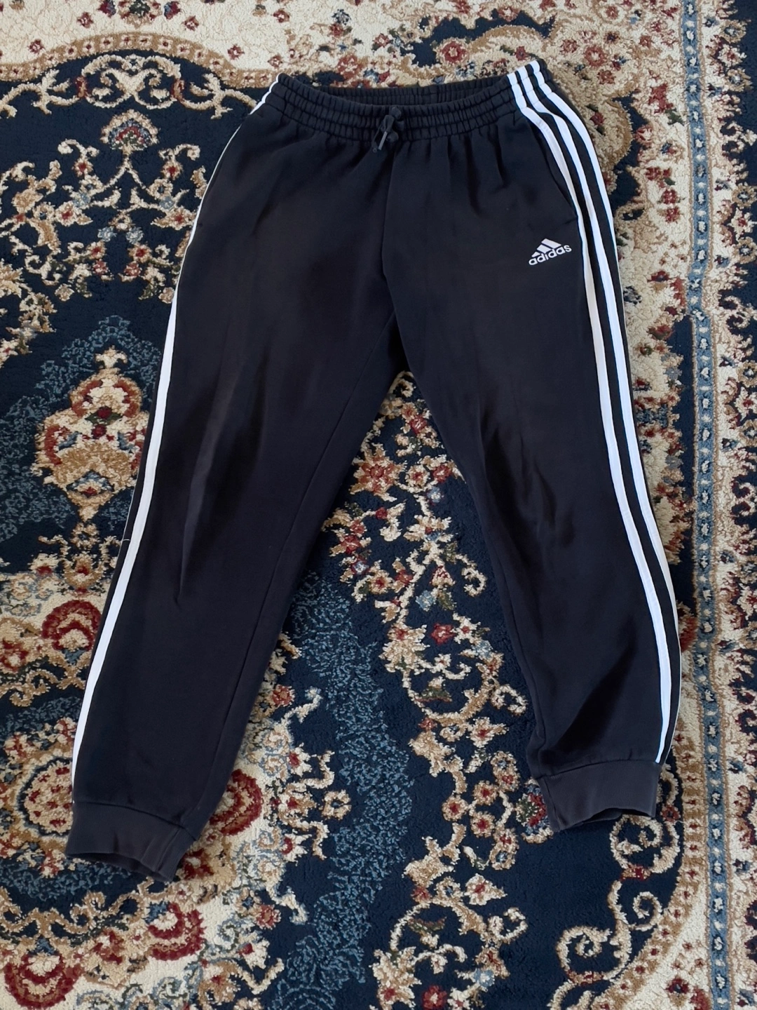 Selling a pair of Adidas black jogger pants in size S. They feature the classic three-stripe design and are in good condition. Perfect for workouts or just lounging around!