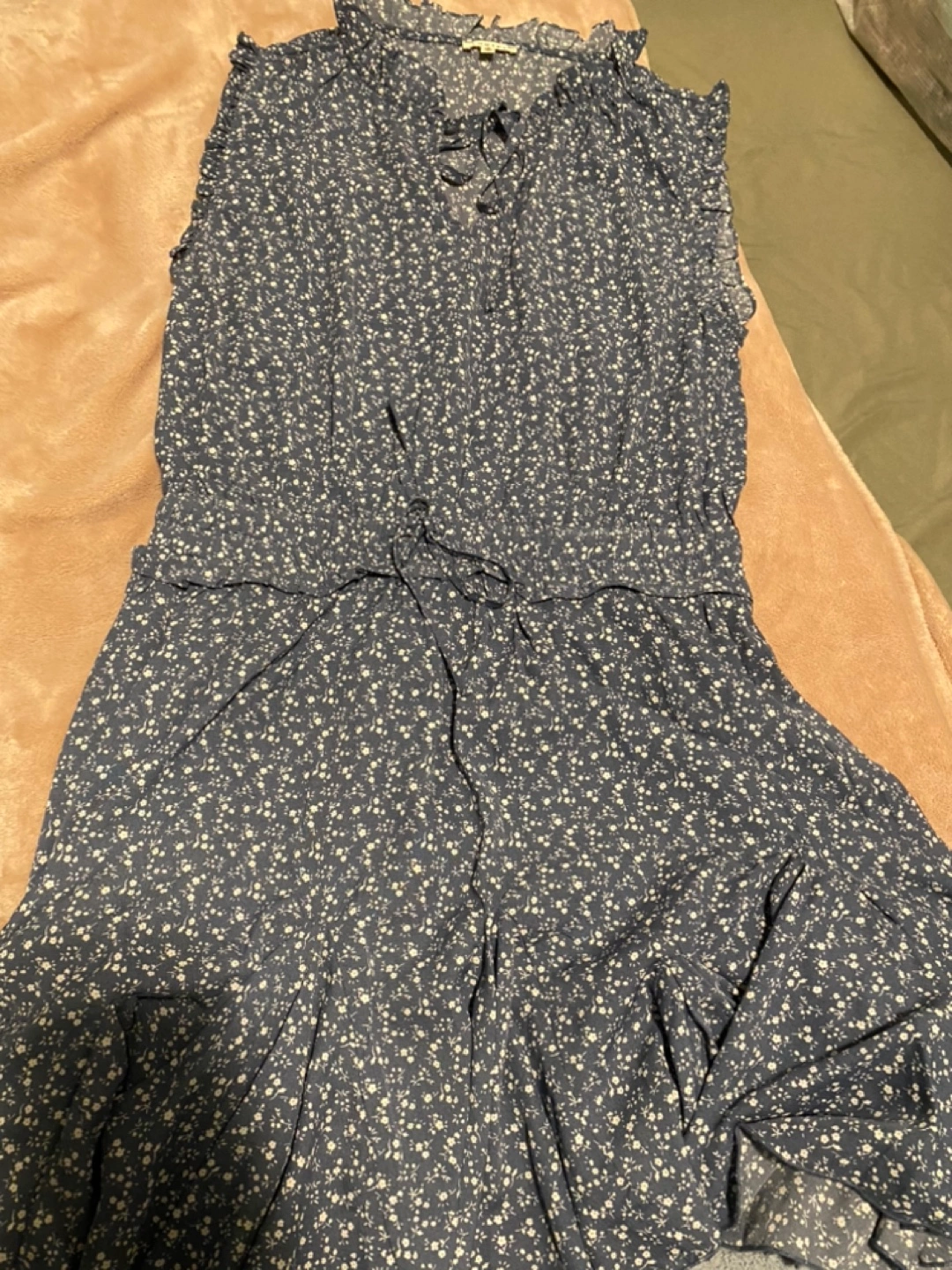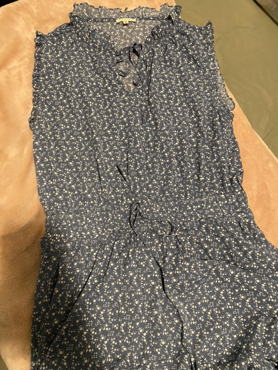 Selling a cute dress with a blue floral print. It has a tie at the waist and a ruffled neckline. Perfect for summer! Size large