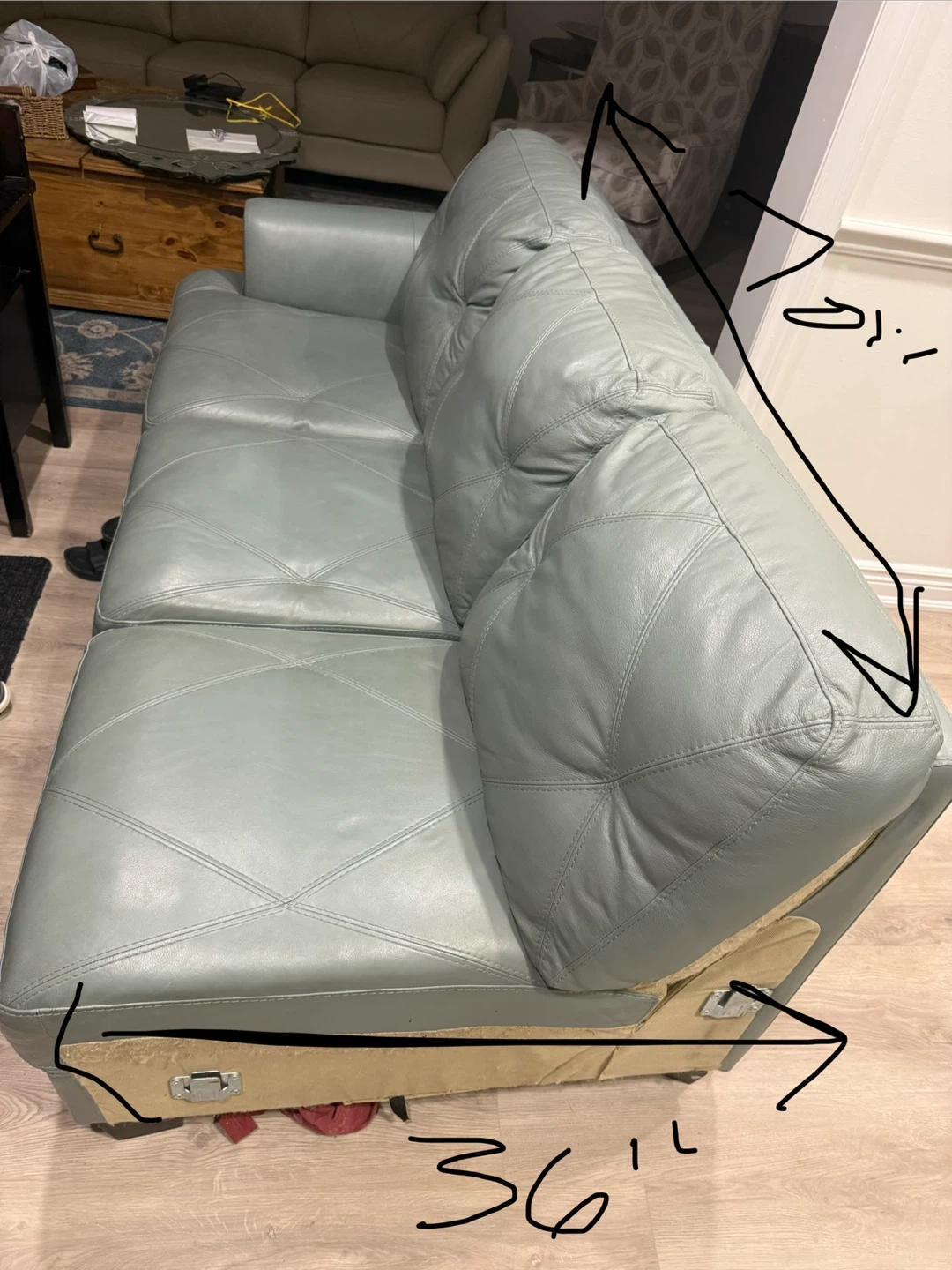 This is a light blue leather sofa section. It features tufted cushions and a diamond stitch pattern on the seat. The depth of the seat is 36 inches. This sofa section would be great for adding extra seating to a living room.