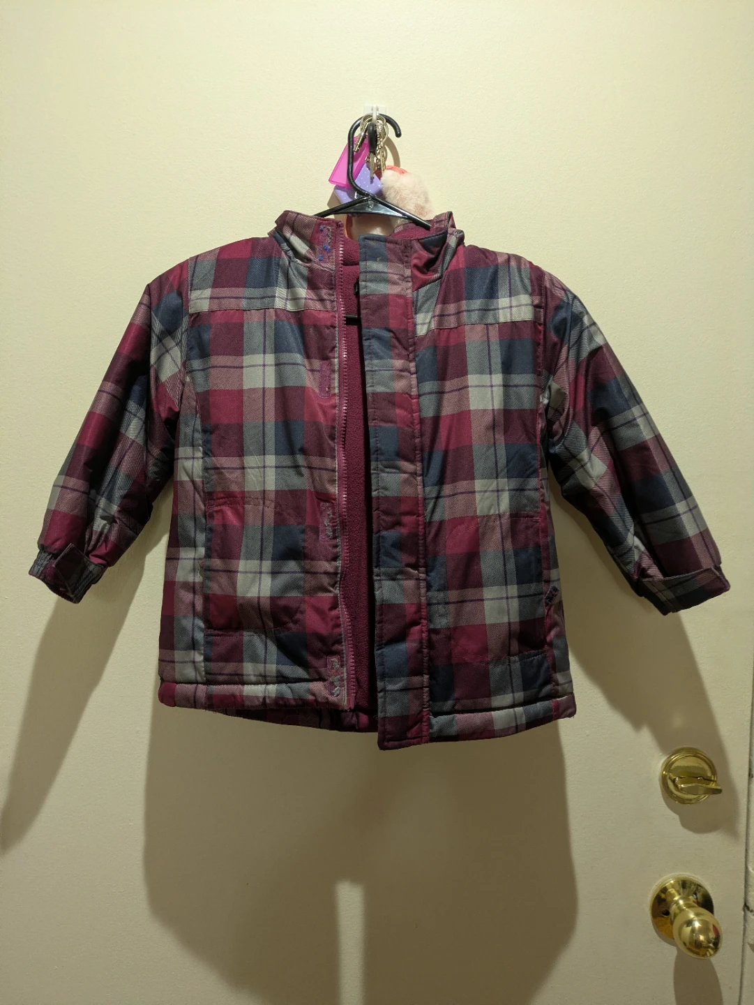 Here's a warm and cozy winter jacket with a classic plaid pattern. It's perfect for keeping your little one snug during the colder months!