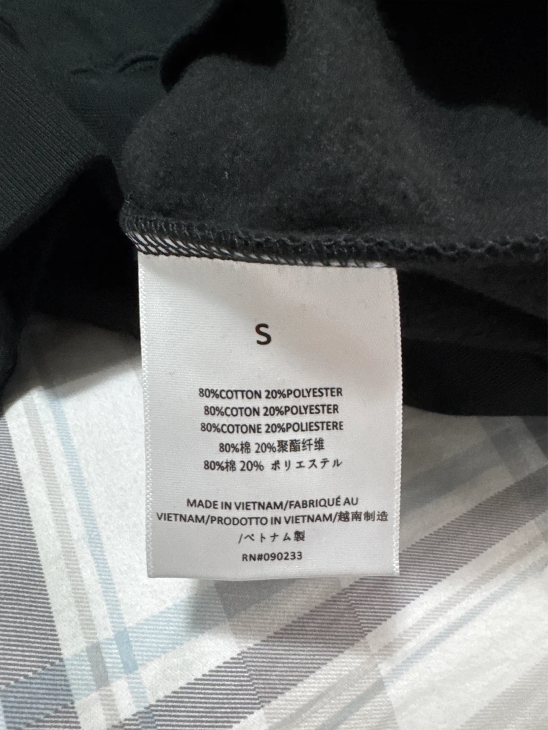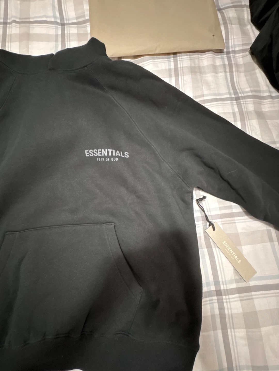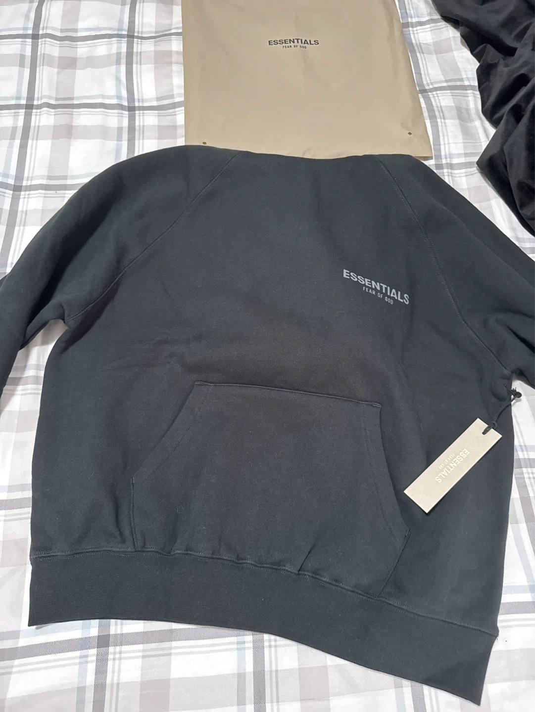 This is a black sweatshirt from Fear of God Essentials. It features the "ESSENTIALS" logo printed on the chest and sleeve. It's a comfortable pullover style with a front pouch pocket.
