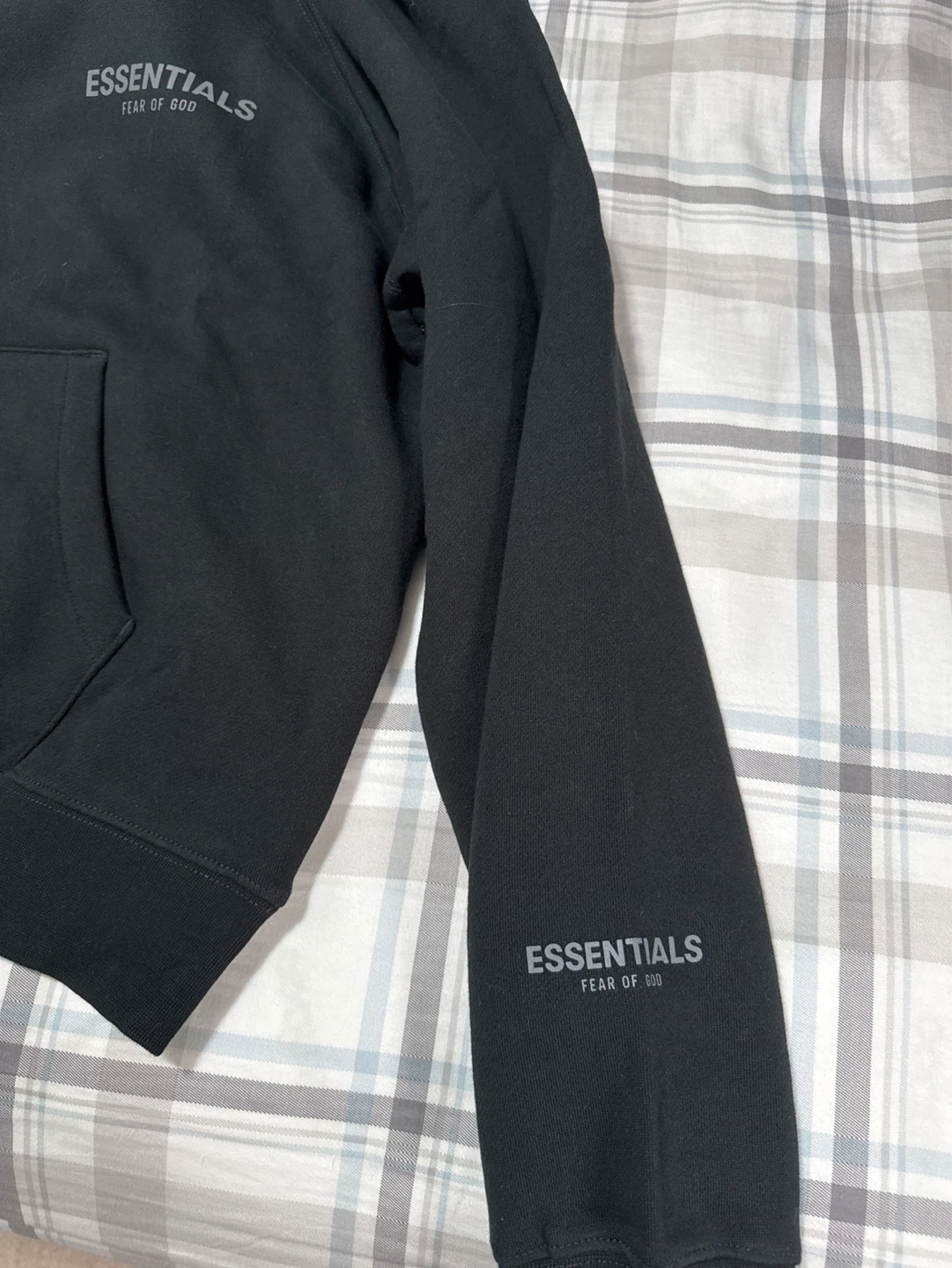 This is a black sweatshirt from Fear of God Essentials. It features the "ESSENTIALS" logo printed on the chest and sleeve. It's a comfortable pullover style with a front pouch pocket.