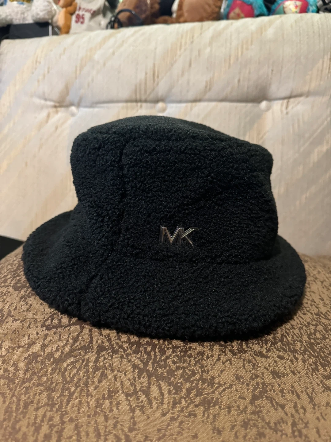 This cozy black bucket hat features a plush sherpa material and a silver MK logo emblem. It's a stylish accessory for cooler weather. One size fits most.