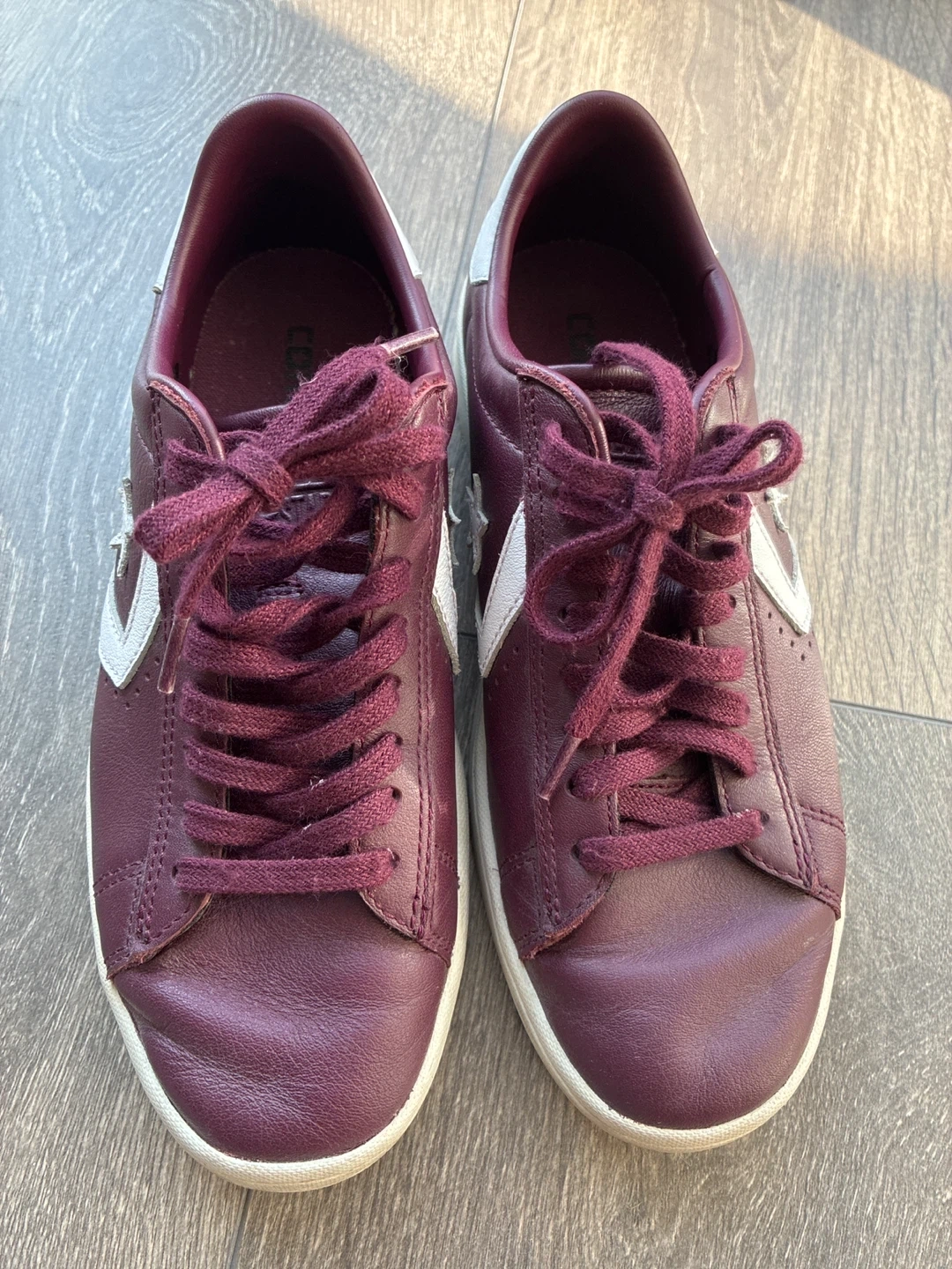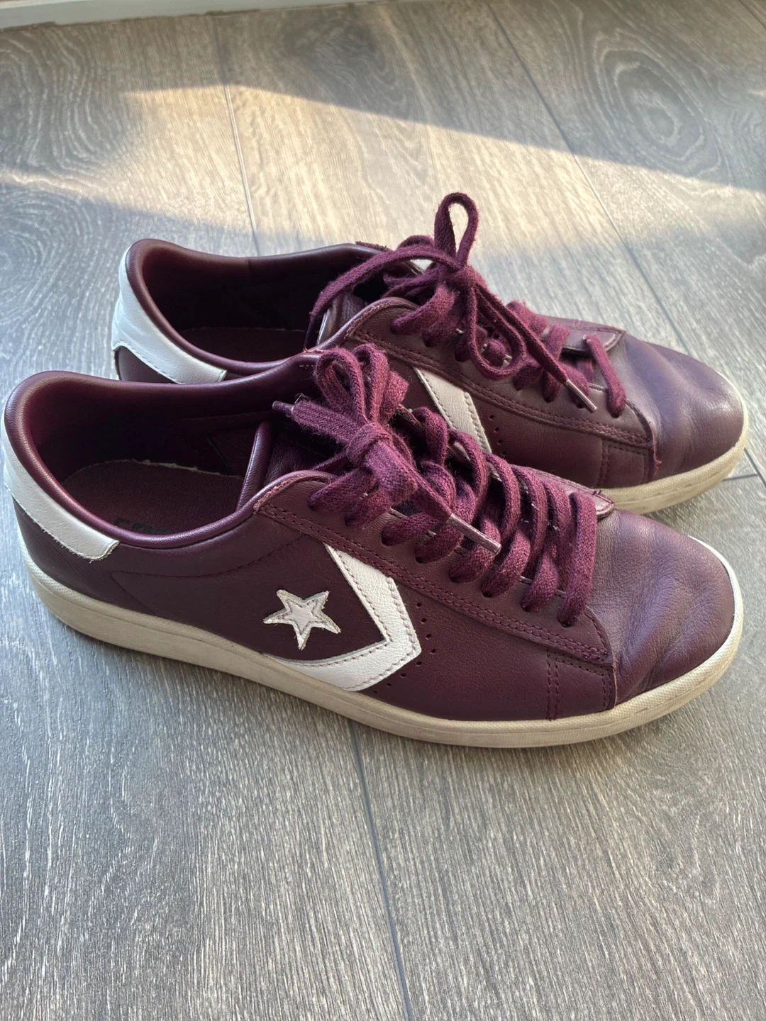 Selling a pair of Converse Pro Leather LP sneakers in a lovely burgundy colour! They are a women's size 6 US. The upper is leather, the lining is textile, and the outsole is rubber.