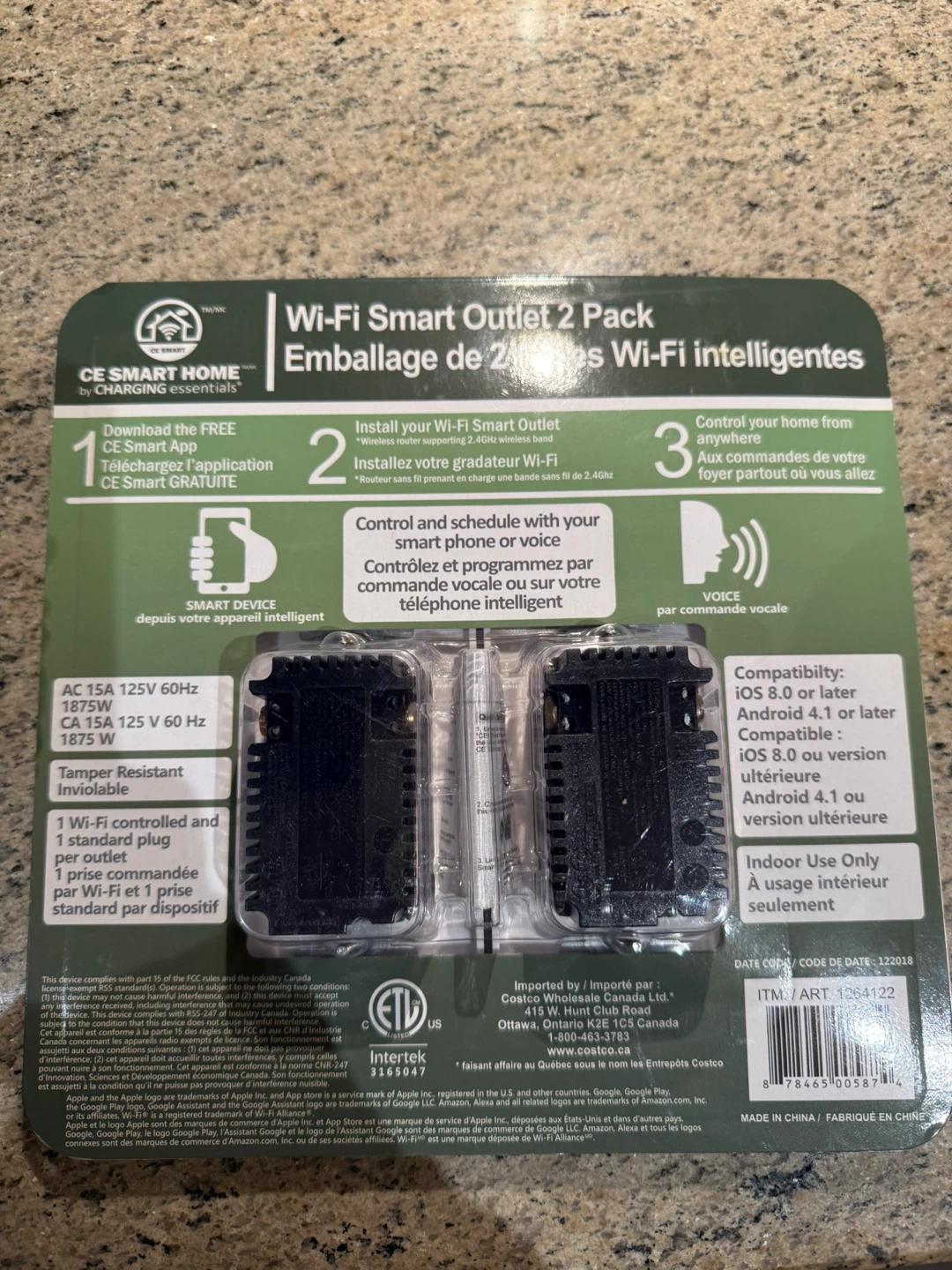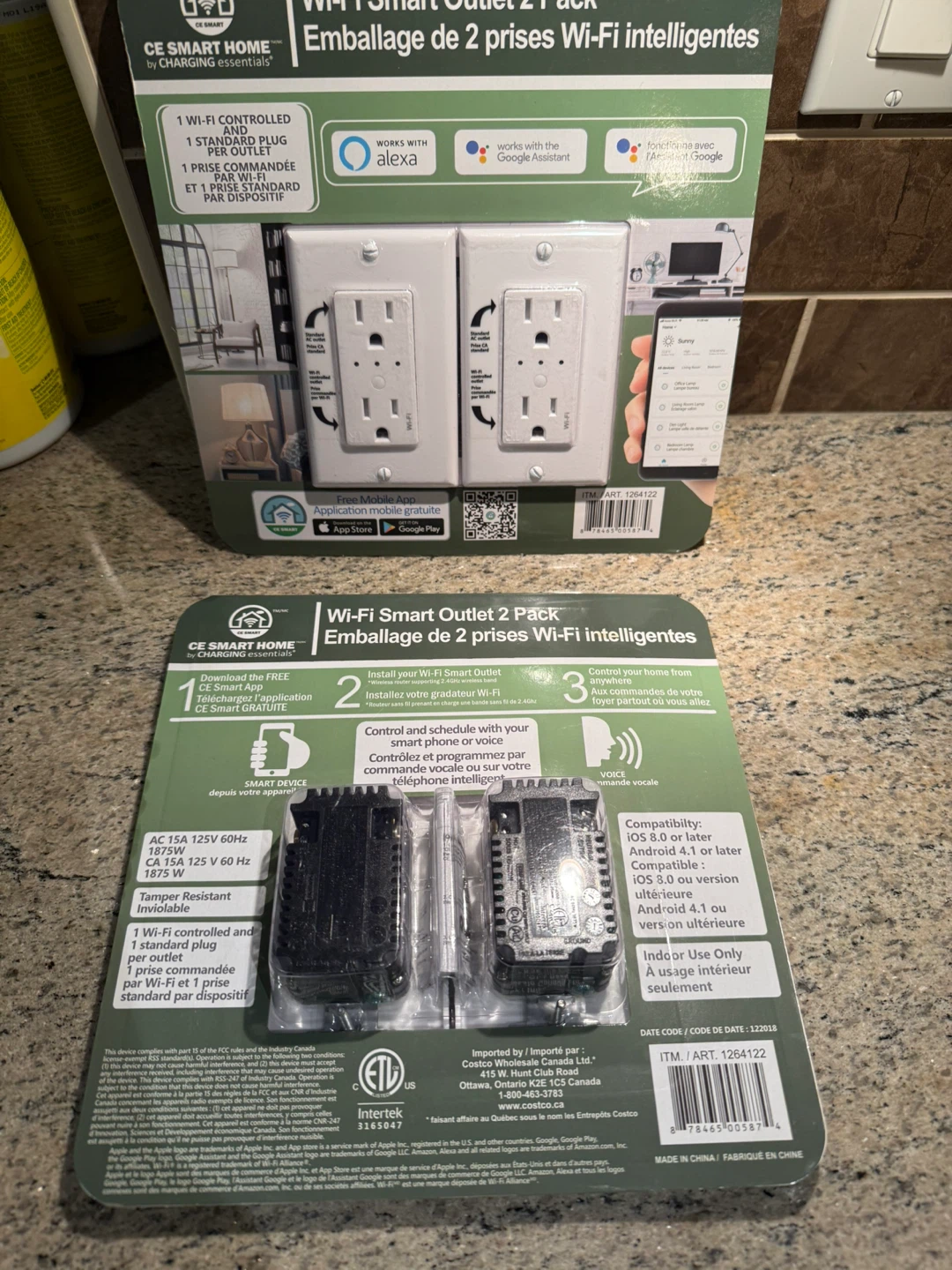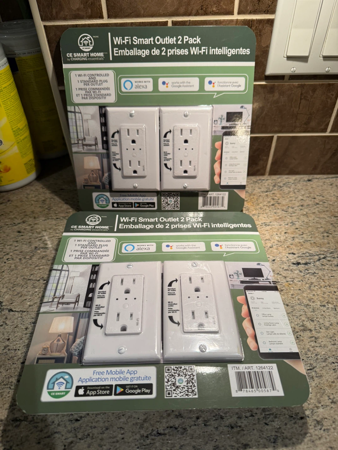 Selling a new CE Smart Home Wi-Fi Smart Outlet 2 Pack. It works with Alexa and Google Assistant. Each outlet is 15A 125V 60Hz, 1875W and 15A 125 V 60 Hz 1875 W. Compatible with iOS 8.0 or later and Android 4.1 or later. $20 each