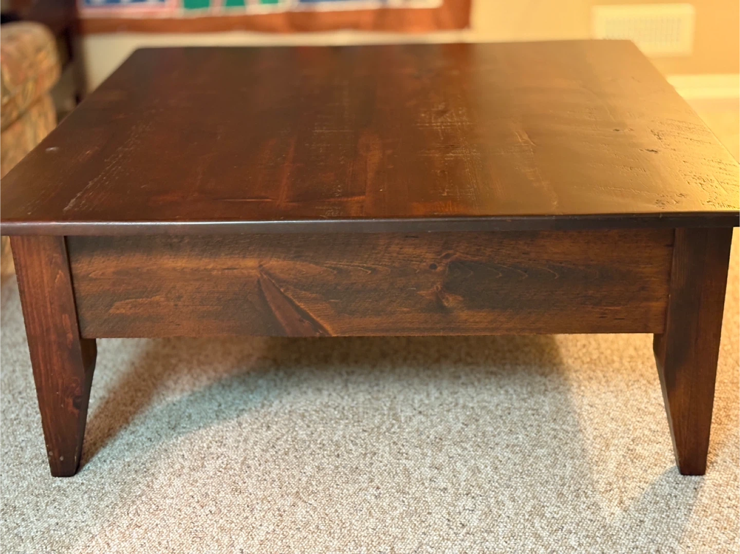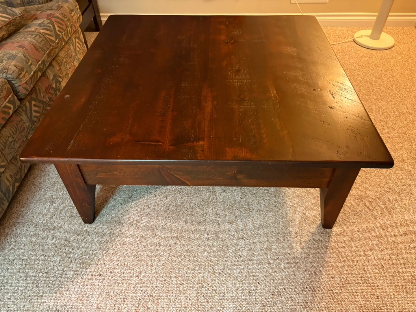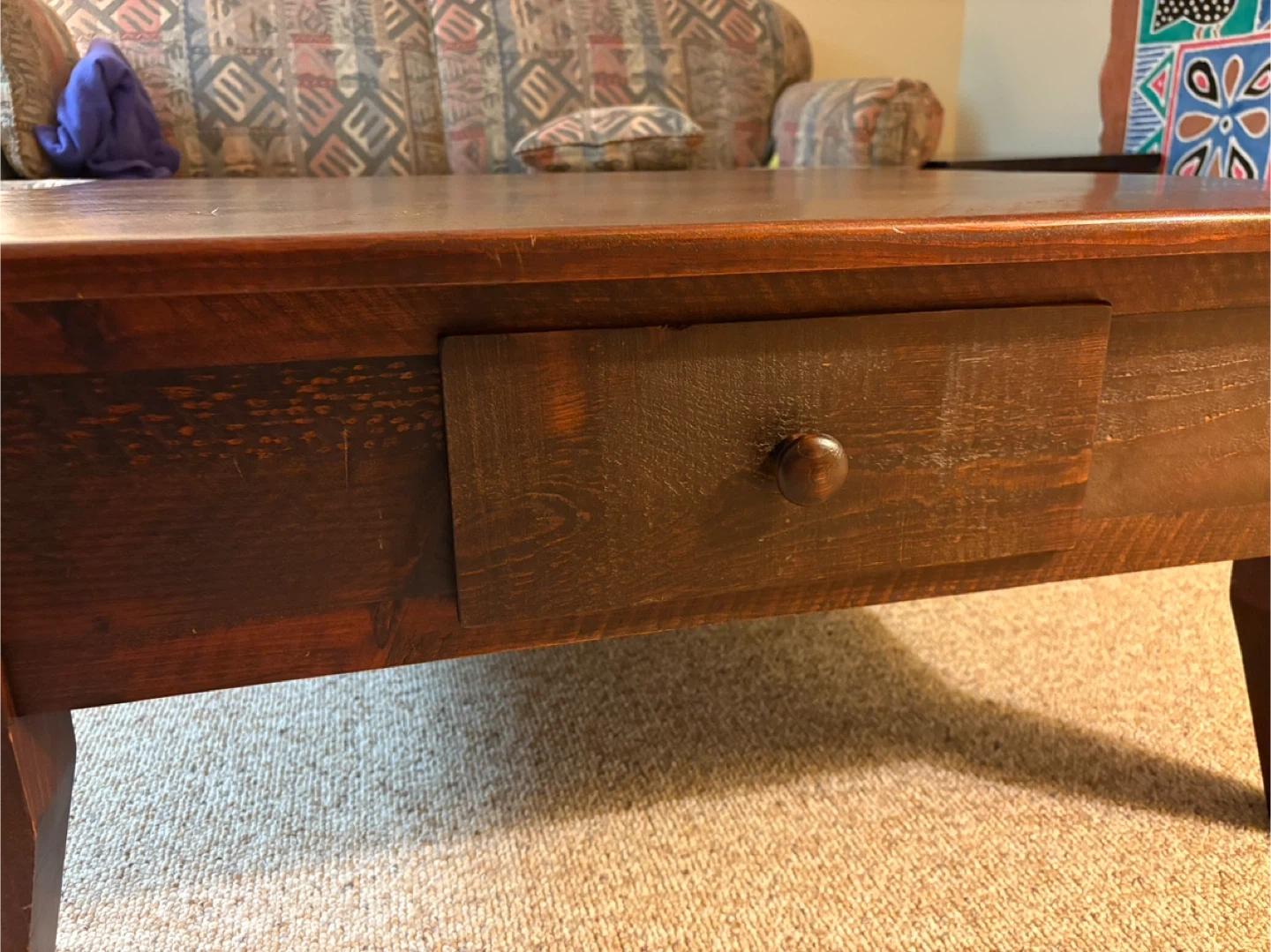 Solid wood coffee table with a dark stain finish. Intentionally not satiny smooth. Two handy drawers.
