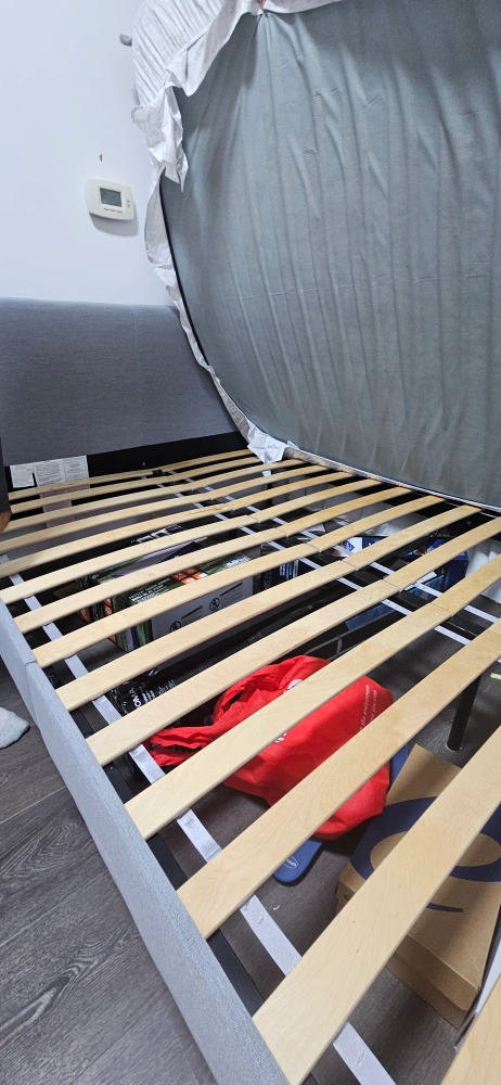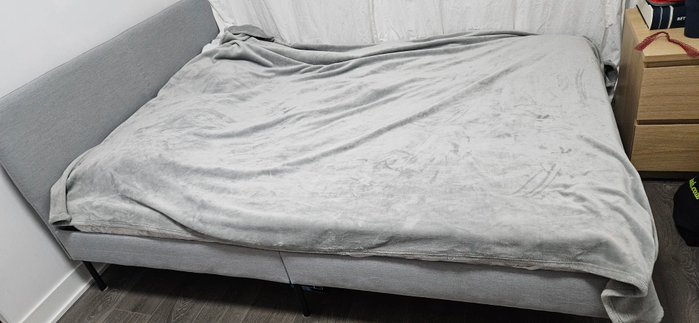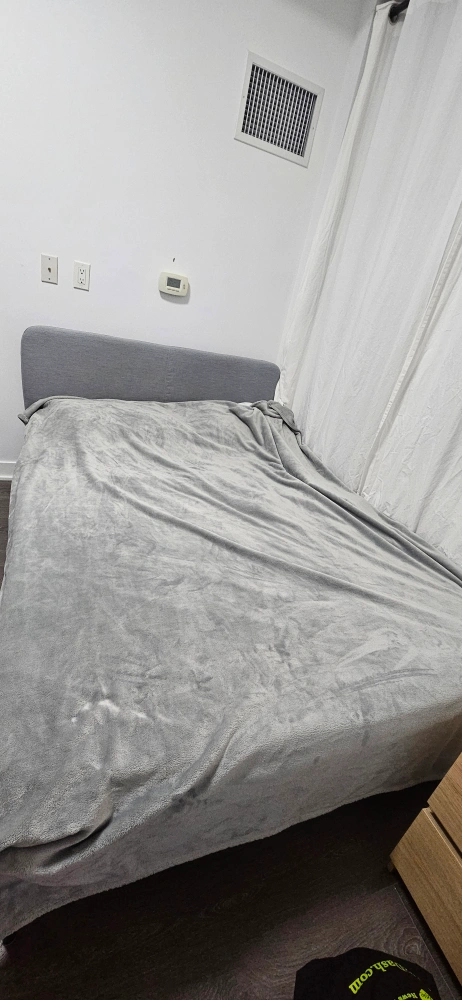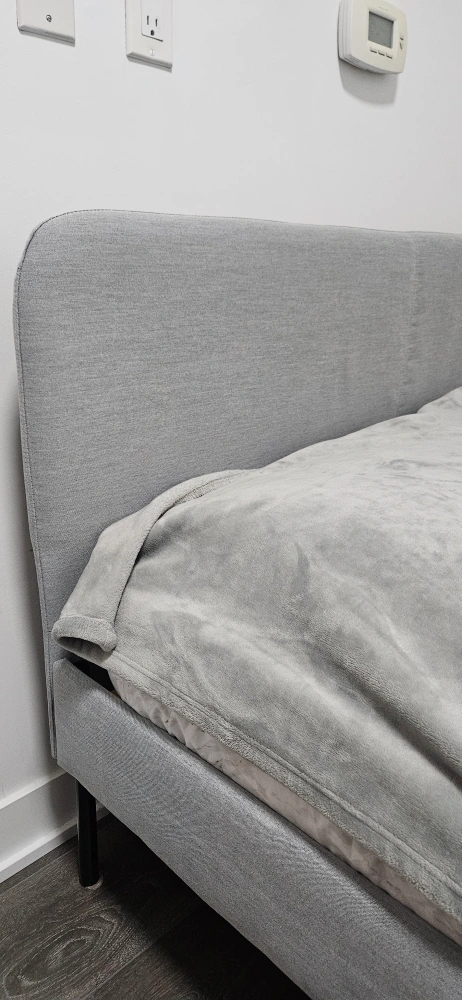 Selling a full size bed frame from IKEA! It's in great shape and ready for a new home. The frame is a neutral grey colour and features a simple, modern design that would fit well in any bedroom. Dimensions on last slide.