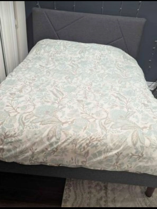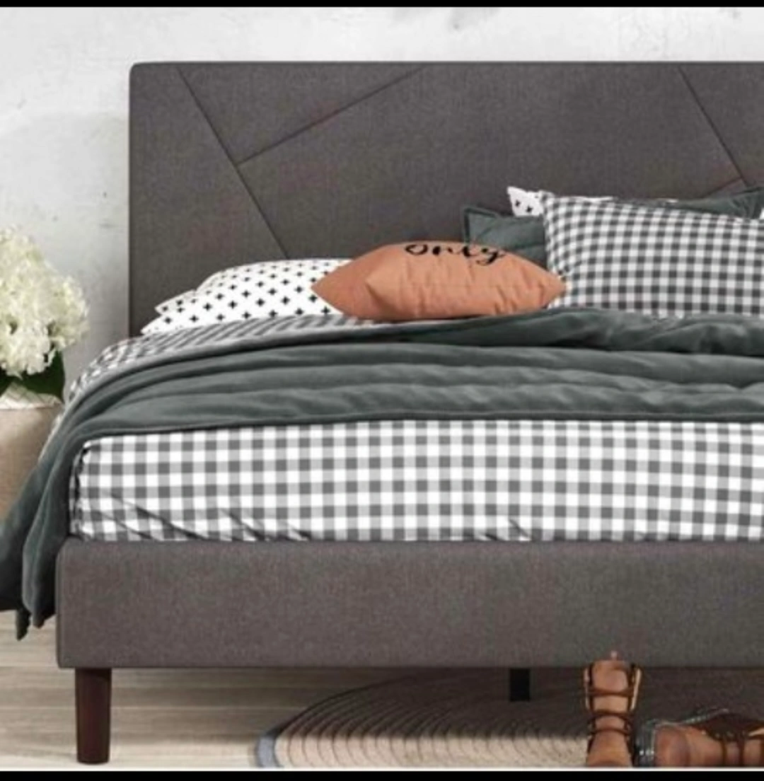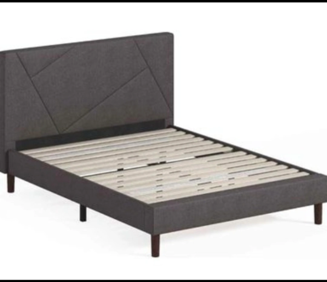 103Zinus Judy Upholstered Platform Bed Frame / Mattress Foundation / Wood Slat Support Queen, Grey. Like new. Can be disassembled and all pieces fit inside the headboard for easy transportation. Used in a clean/shoe-free/pet-free/smoke-free home. Check out my profile for our other moving sale items (discount available for purchasing multiple items).