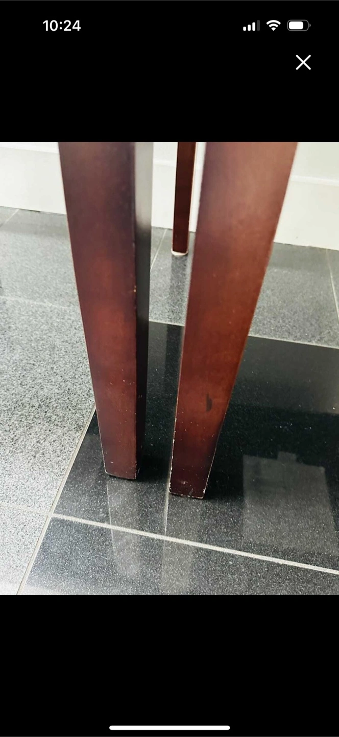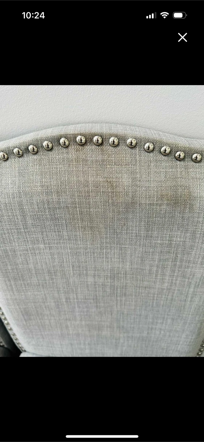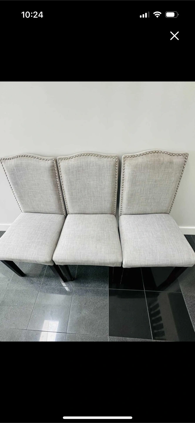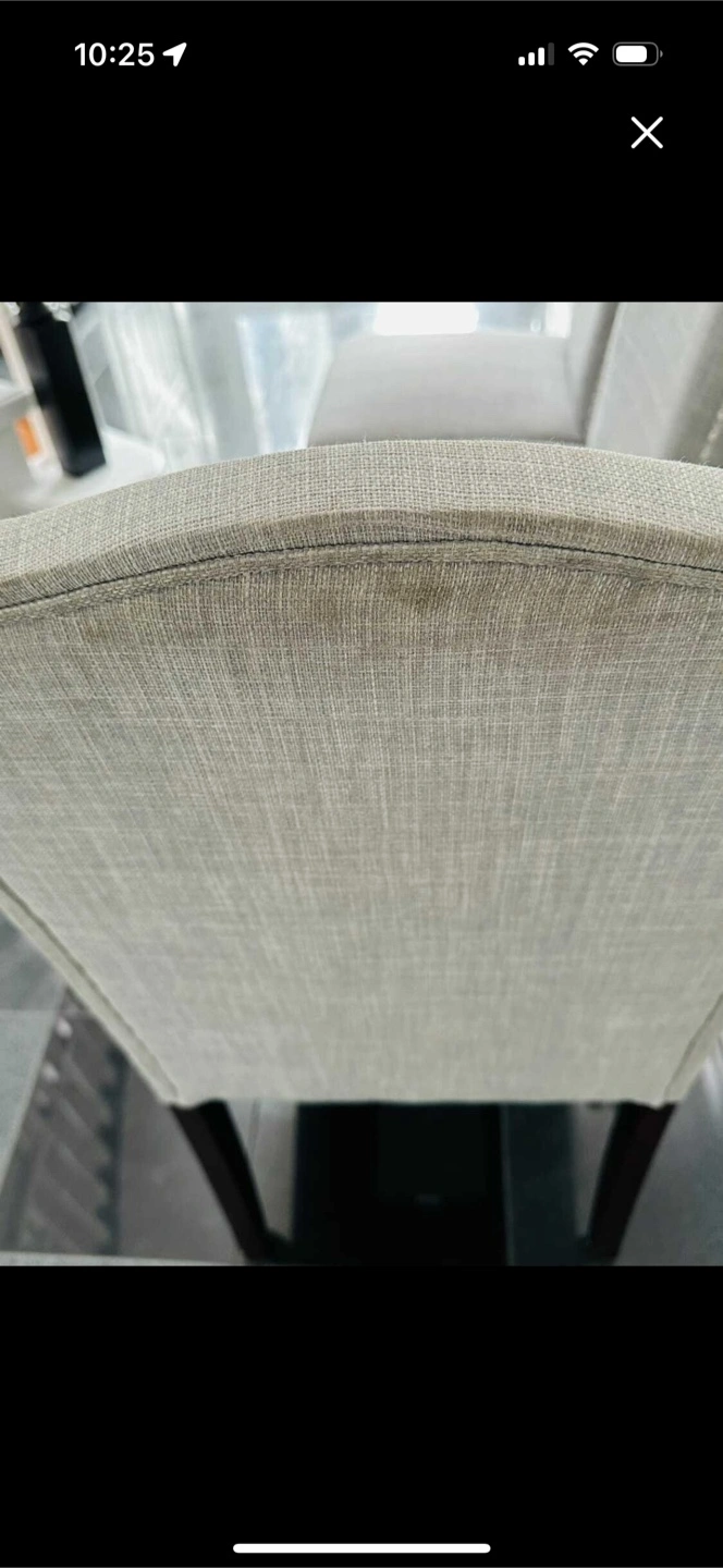 5Selling a set of four upholstered dining chairs. They have a neutral colour fabric and dark wood legs. There are some signs of wear on the fabric and legs, as shown in the photos. P/u Bridgeport and no 4