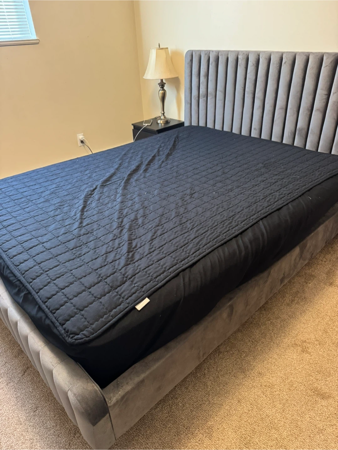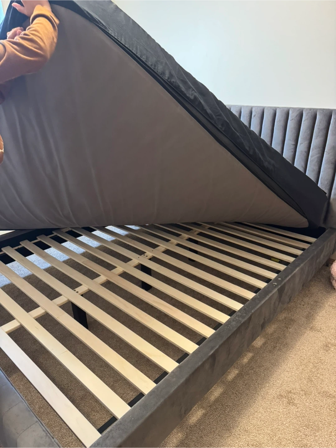 65Selling my upholstered queen bed frame. It’s sturdy, modern, and in excellent condition. Only used gently and well-kept — no damage, no stains, no squeaking. Features: • Stylish grey upholstered headboard with vertical panel design • Strong wooden slats for great support (no box spring needed) • Solid frame, very stable • Easy to assemble • Fits any standard queen mattress Perfect for anyone looking for a clean, modern bed frame at a good price. Pickup only in leduc. Message me for more details or to arrange pickup!