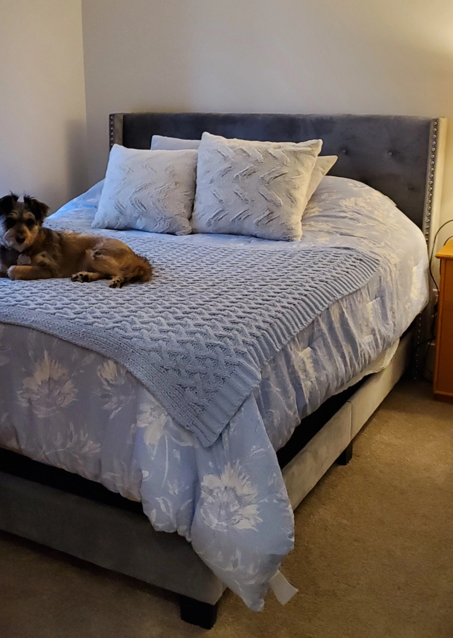 Looking to upgrade your bedroom? I'm selling a lovely upholstered Queen size wingback platform bed frame. It's in great condition and would add a touch of elegance to any room. The blue colour is neutral and versatile, fitting well with various decor styles. It's a sturdy and stylish choice! It is already disassembled and ready to go in my storage locker.