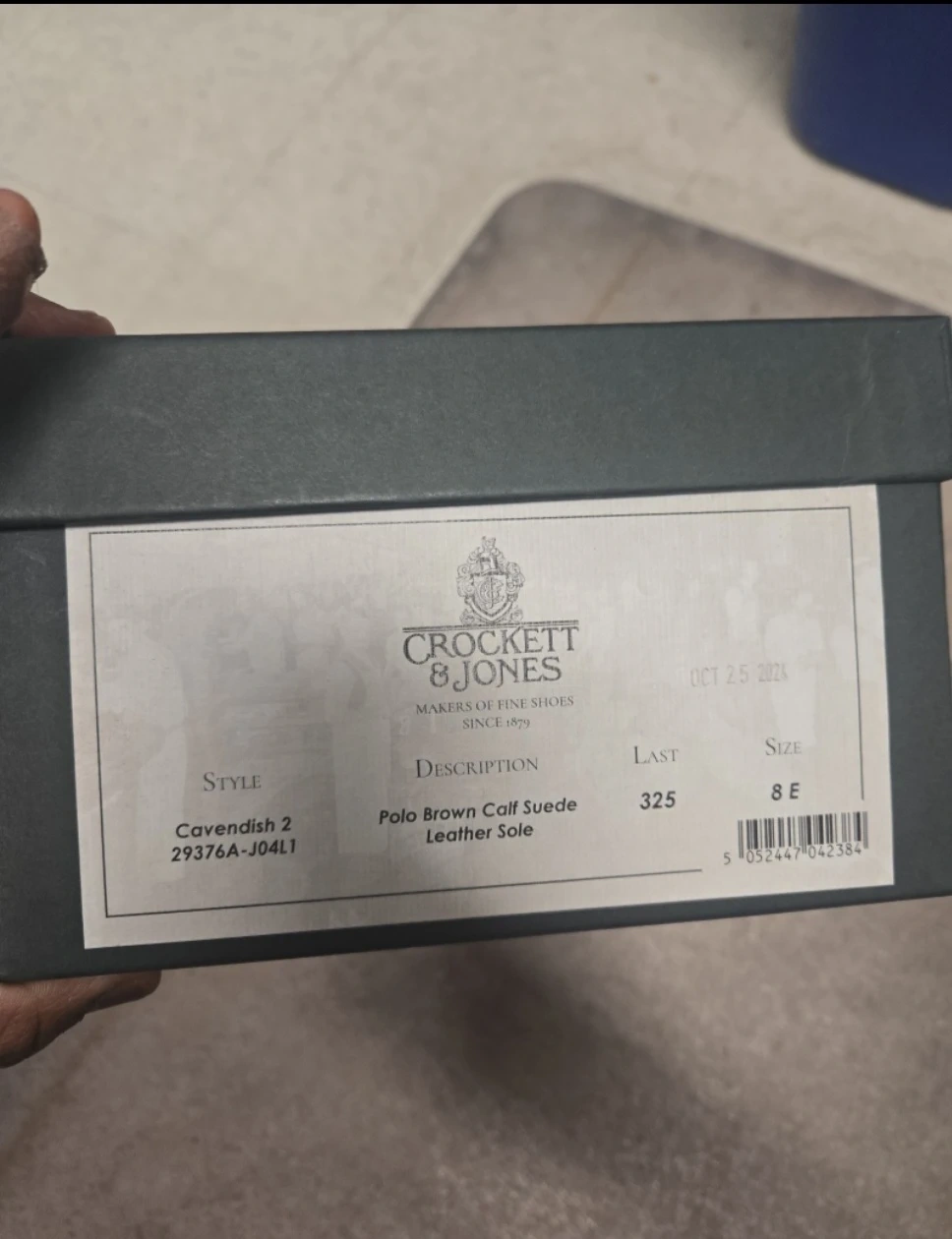 These are Crockett & Jones Cavendish 2 loafers. They're made of polo brown calf suede with leather soles. Includes original box.