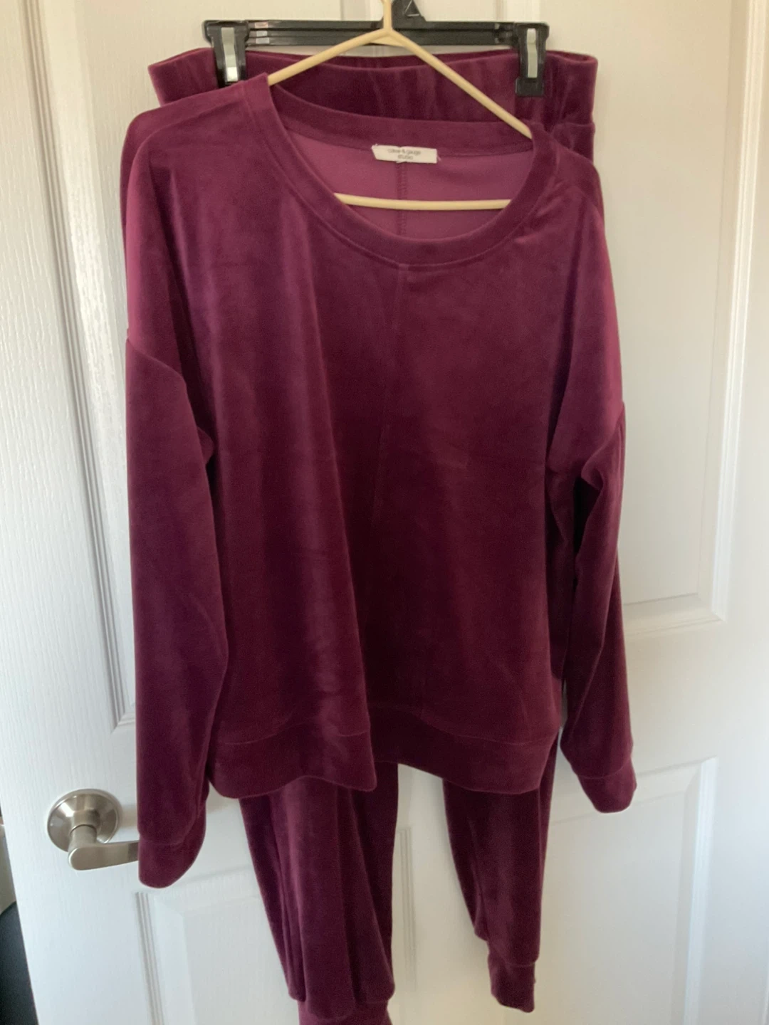 Cozy velour jogger set in a rich plum colour. Features a crewneck sweatshirt and matching elastic waist joggers. Made of soft velour fabric.
