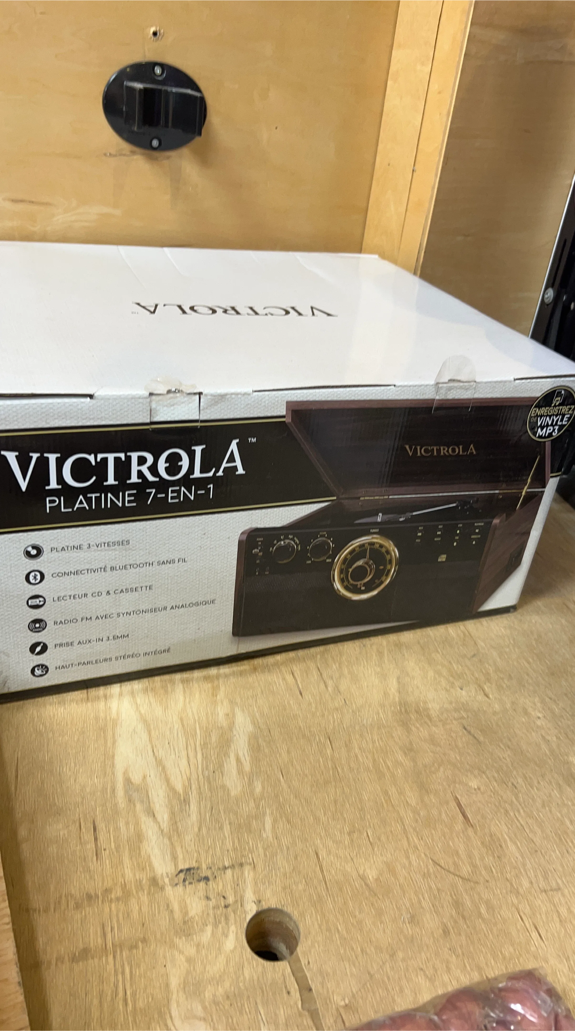 Selling a Victrola 7-EN-1 Platine. It has 3 speeds, Bluetooth connectivity, a CD and cassette player, FM radio, a 3.5mm aux input, and built-in stereo speakers. It also records vinyl to MP3! Box included