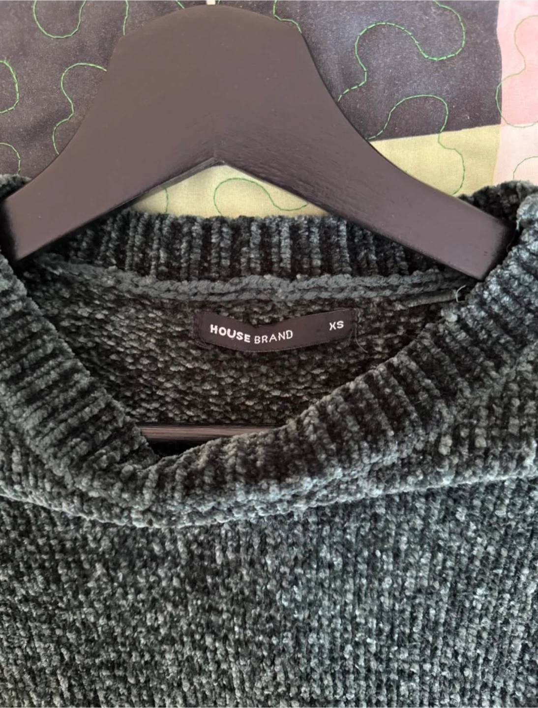 A dark green chenille sweater from HOUSE BRAND. It's a cozy piece perfect for cooler weather. Size is extra small.