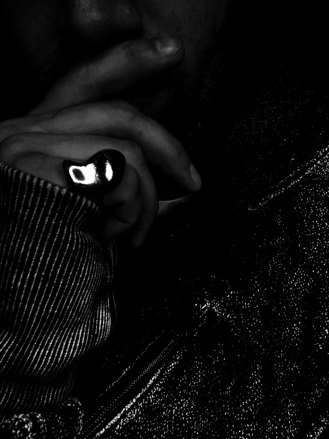 A unique, large statement ring with an abstract, sculptural design. It's crafted from a shiny silver. This eye-catching piece is perfect for adding a bold touch to any outfit. Its significant size makes it a true conversation starter!