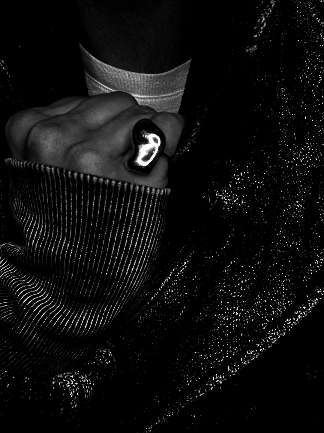 A unique, large statement ring with an abstract, sculptural design. It's crafted from a shiny silver. This eye-catching piece is perfect for adding a bold touch to any outfit. Its significant size makes it a true conversation starter!