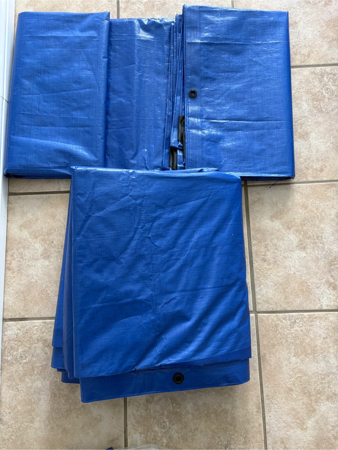 This is two blue tarp. They have grommets along the edges for secure fastening. It's a versatile item for covering or protecting things. I bought them at Costco, only used once.