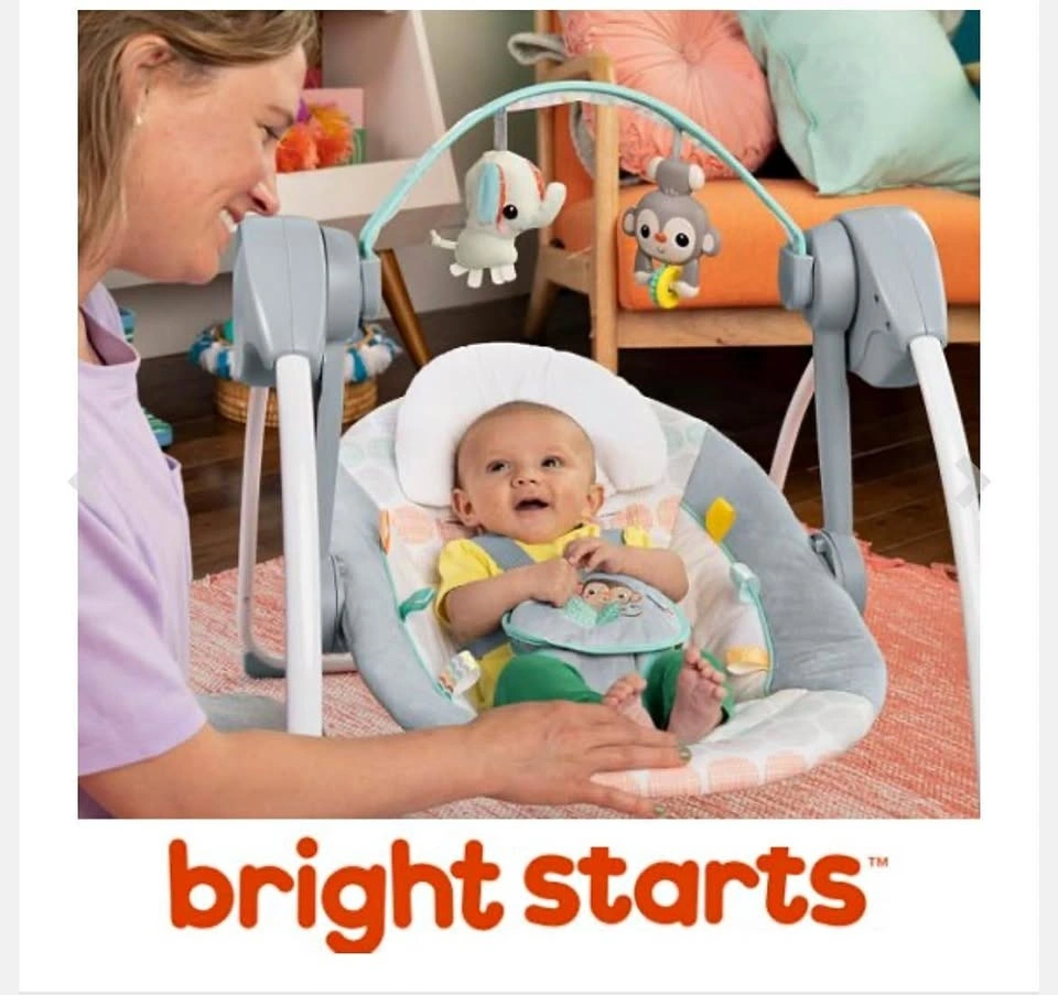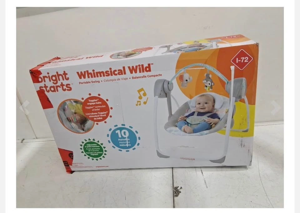 Brand new Bright Starts Whimsical Wild Portable Baby Swing, Model 11803 – open box only, never used. It features 6 adjustable swing speeds for soothing and comfort, Taggies sensory toys with a removable toy bar, and built-in music and melodies to calm your baby. It has 2 recline positions and a secure 5-point harness. It's foldable and portable, perfect for small spaces or travel. Suitable for newborns up to 9 months (up to 20 lbs). Batteries not included. Perfect as a gift or for your newborn without paying full retail price. Smoke-free home.