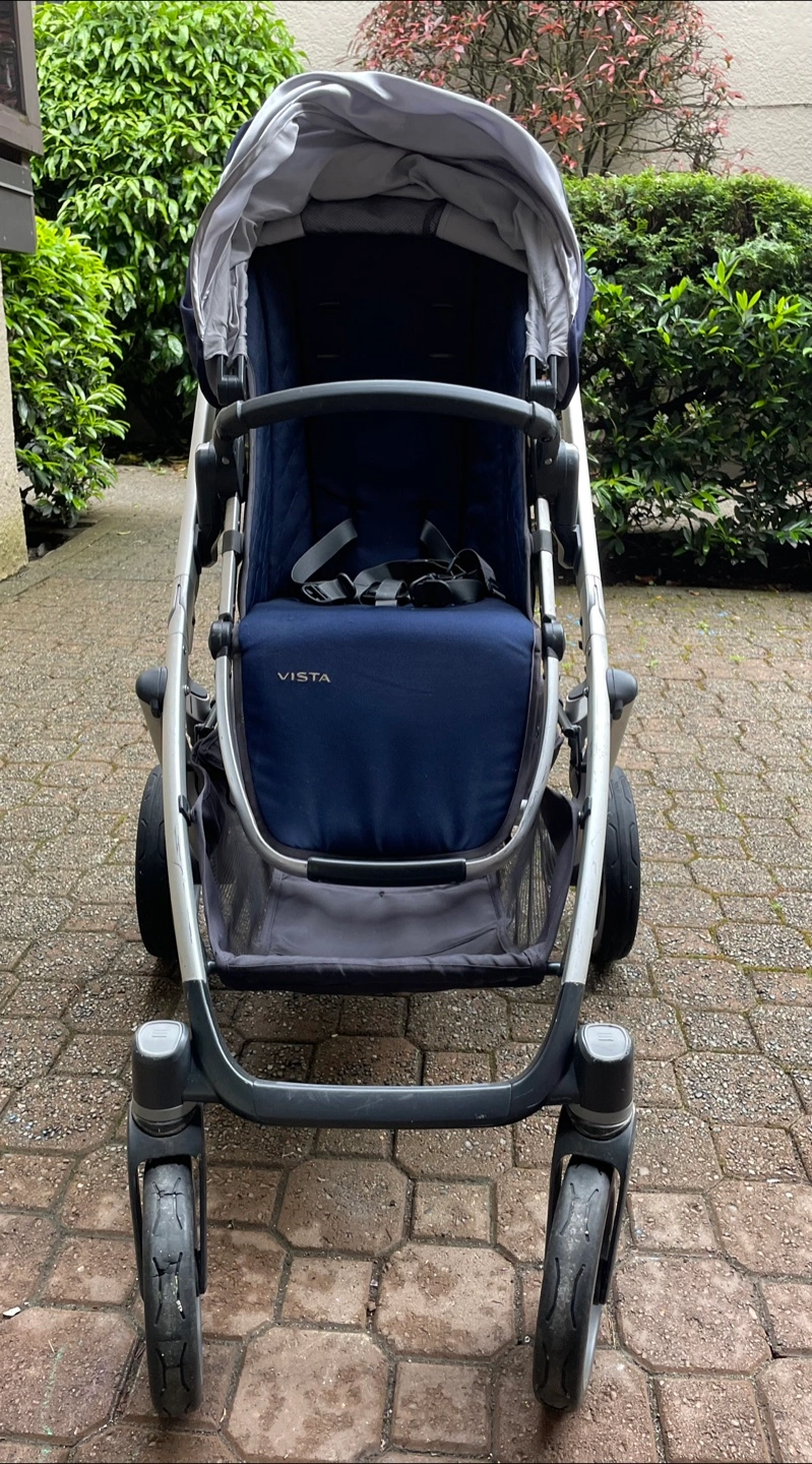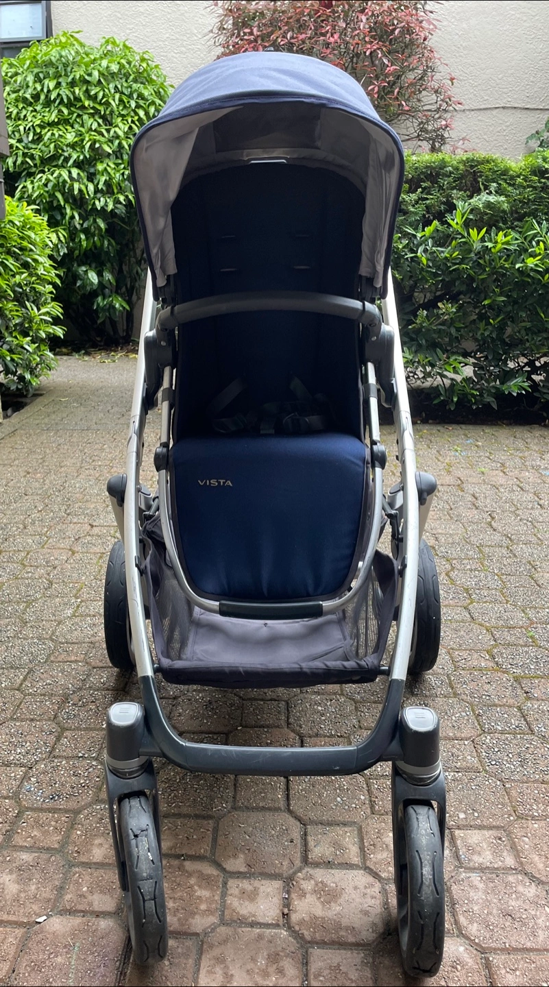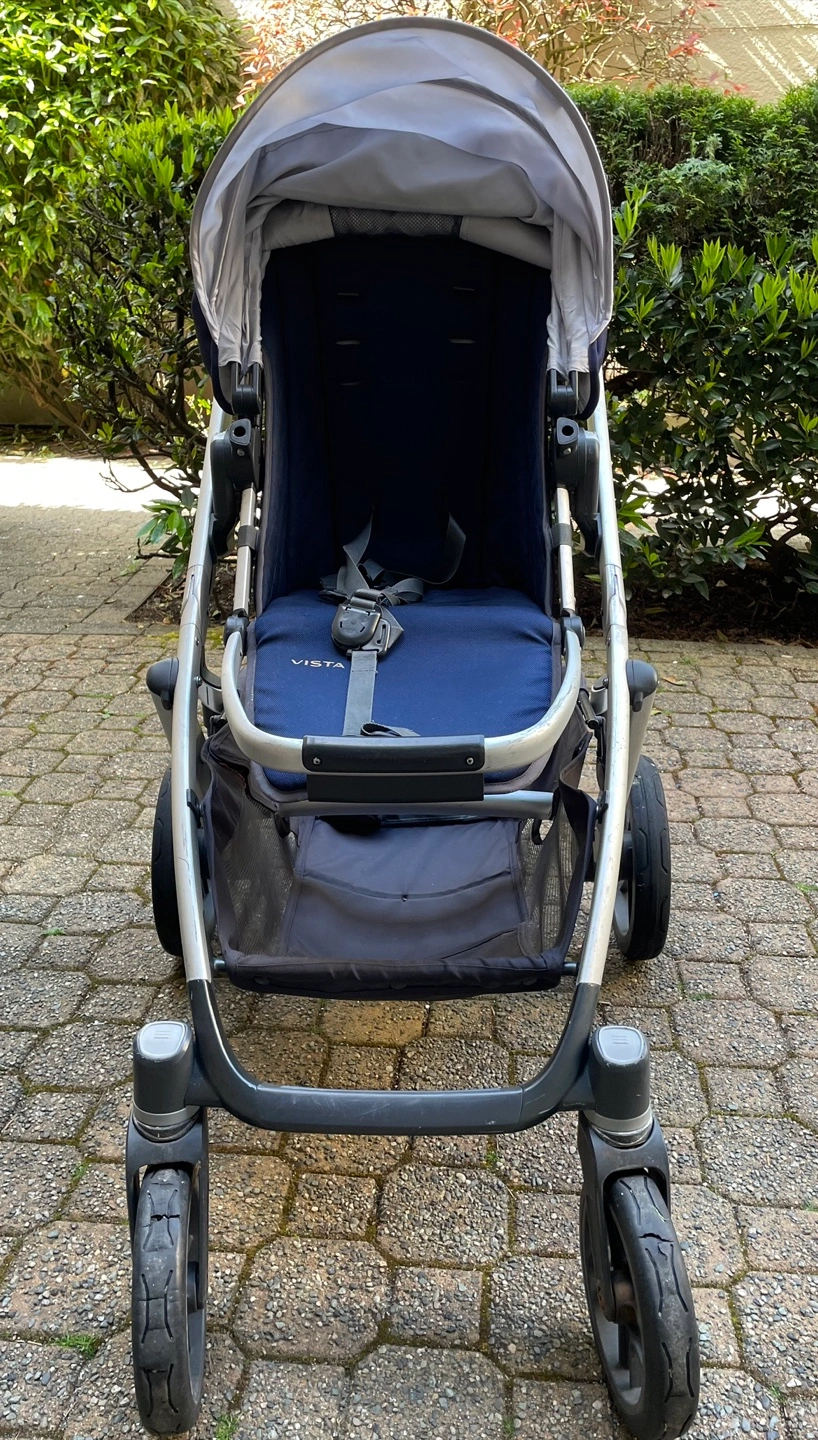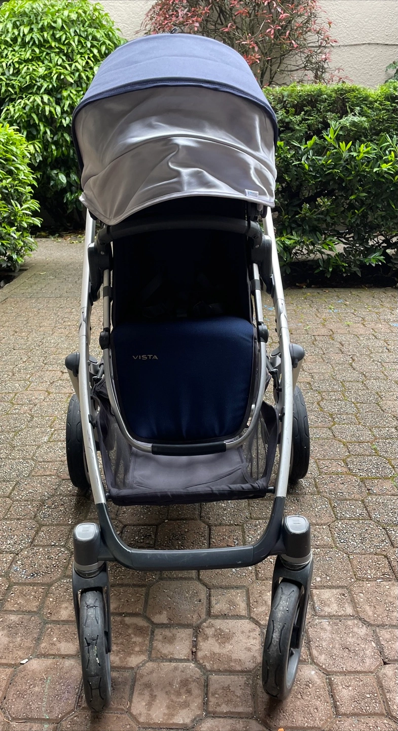 UPPAbaby Vista stroller. Navy blue fabric. Includes bassinet. Great condition. Silver frame. Undercarriage storage basket.