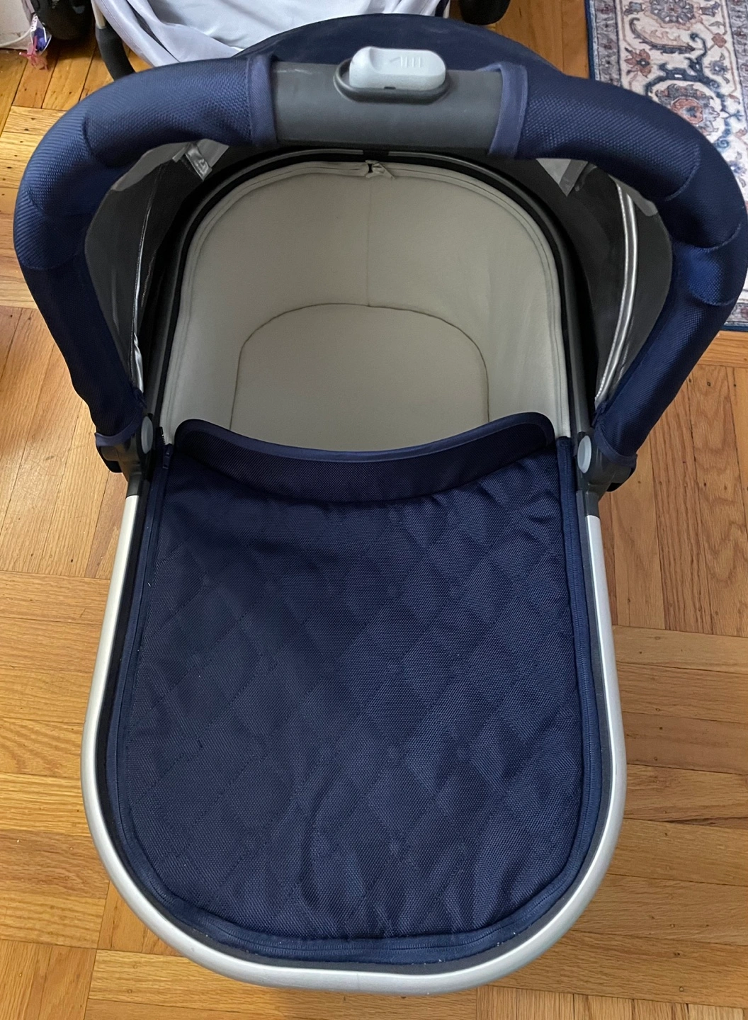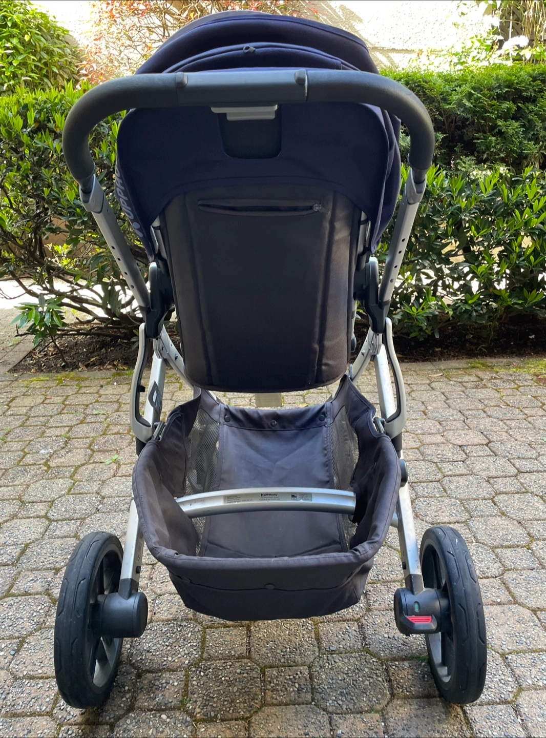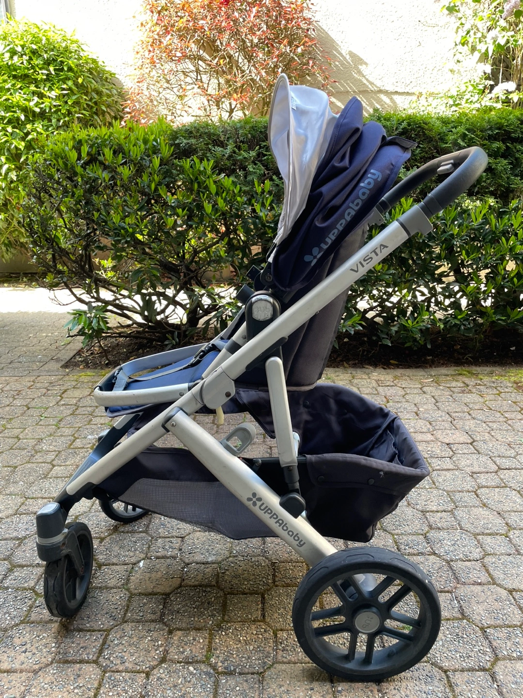 UPPAbaby Vista stroller. Navy blue fabric. Includes bassinet. Great condition. Silver frame. Undercarriage storage basket.