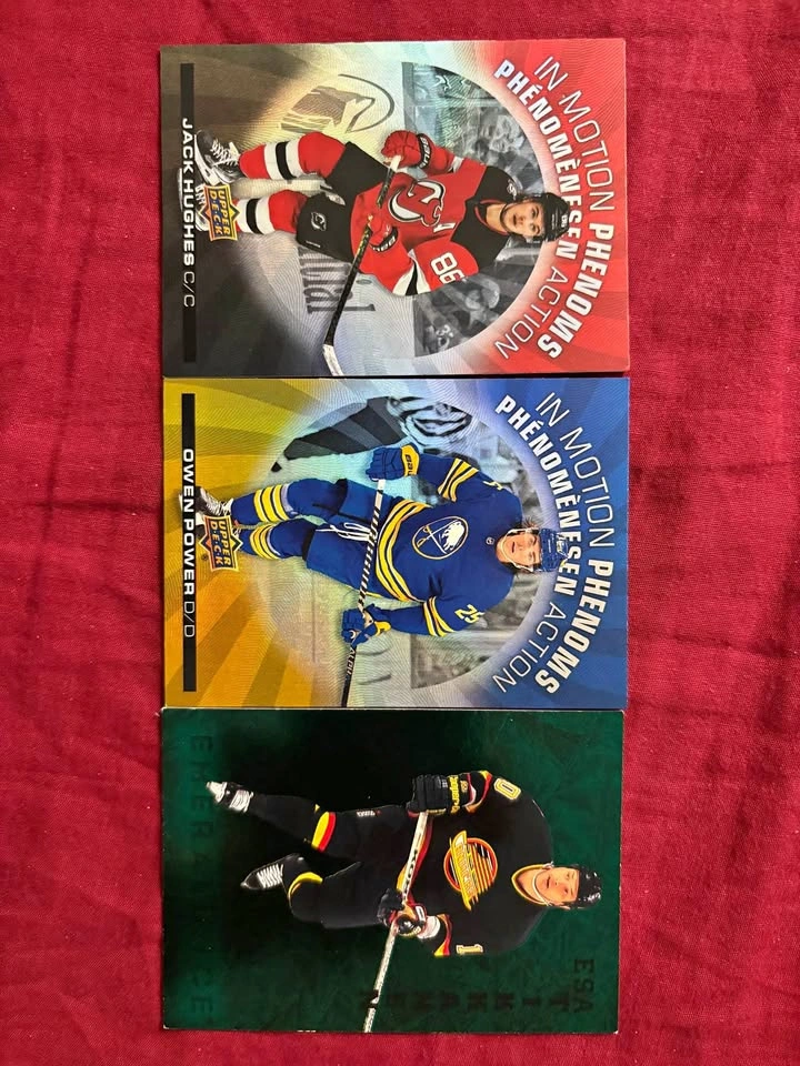 60Rare premium hockey card lot featuring Hall of Fame legend and top NHL stars! 🌟 FEATURED CARDS: ✅ PAVEL BURE - Vancouver Canucks - HALL OF FAME LEGEND! 🏆 • “The Russian Rocket” - One of the most electrifying players ever! • Premium holographic “In Motion Phenomenal Action” insert ✅ OWEN POWER - Buffalo Sabres - 2021 #1 Overall Pick • Elite young defenseman with huge upside • Premium foil insert card ✅ JACK EICHEL - New Jersey Devils/Vegas Golden Knights • Former 2nd overall pick, elite NHL center • Premium “In Motion Phenomenal Action” insert 🎯 SPECIAL FEATURES: • All cards are premium “In Motion Phenomenal Action” inserts • Stunning holographic/foil finishes • Upper Deck quality • Mix of HOF legend and current stars • Hard-to-find insert set Condition: Near Mint to Mint - cards have sharp corners, vibrant foil effects, no visible damage Perfect For: • Pavel Bure collectors (HOF legend!) • Buffalo Sabres fans (Power #1 pick) • Vegas Golden Knights/Eichel collectors • Premium insert card collectors • Hockey card investors • Canucks nostalgia fans