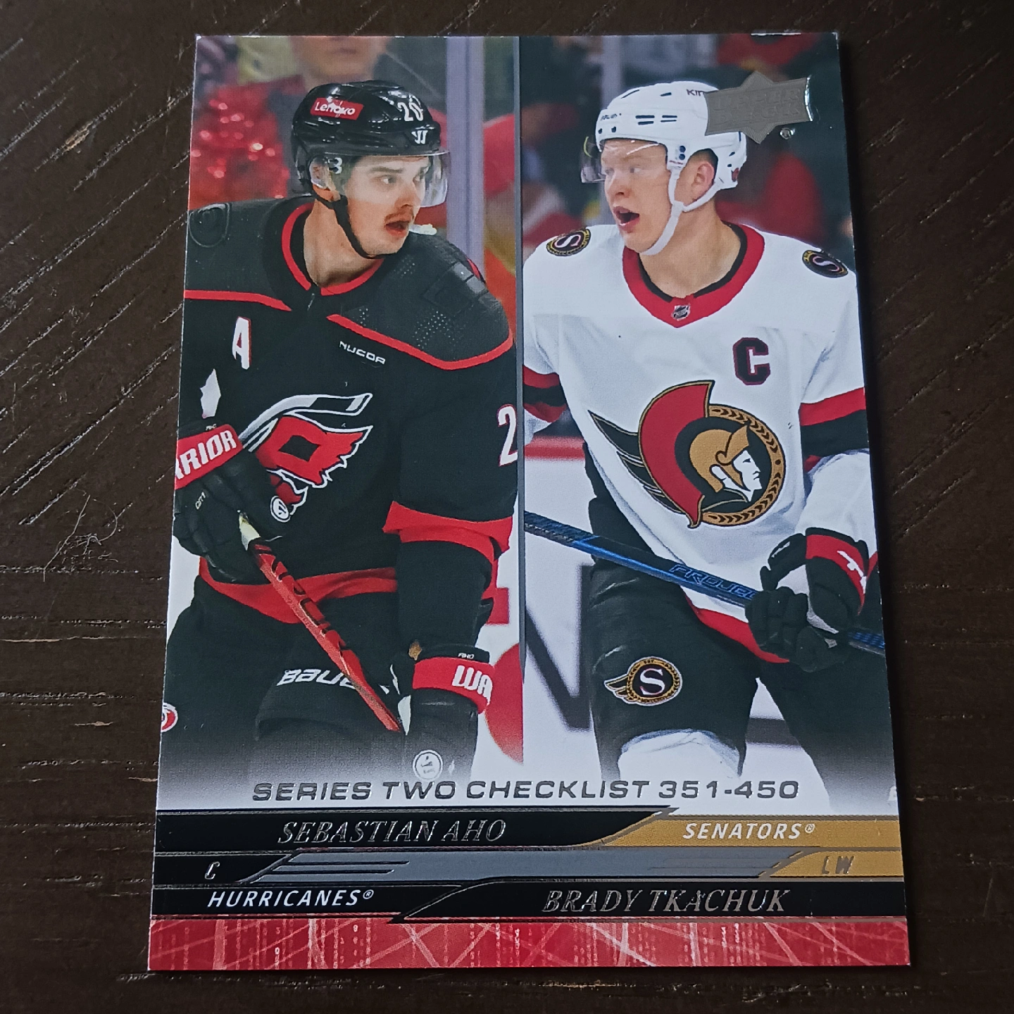 26Selling an Upper Deck Series Two hockey card featuring Sebastian Aho of the Hurricanes and Brady Tkachuk of the Senators! This card is from the 2024-25 series and is part of the checklist 351-450