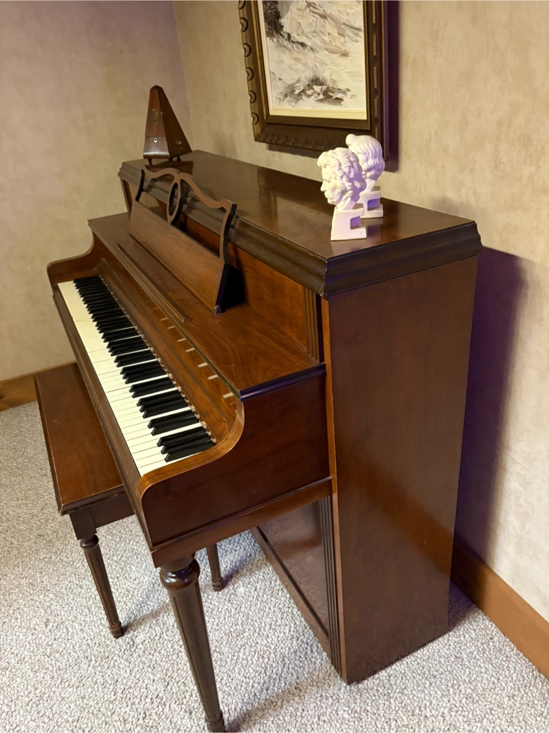 Upright piano in good condition. Comes with a matching bench. Perfect for beginners or experienced players alike! It's a beautiful piece of furniture and a musical instrument all in one Needs tuning $150 plus get CASH ONLY