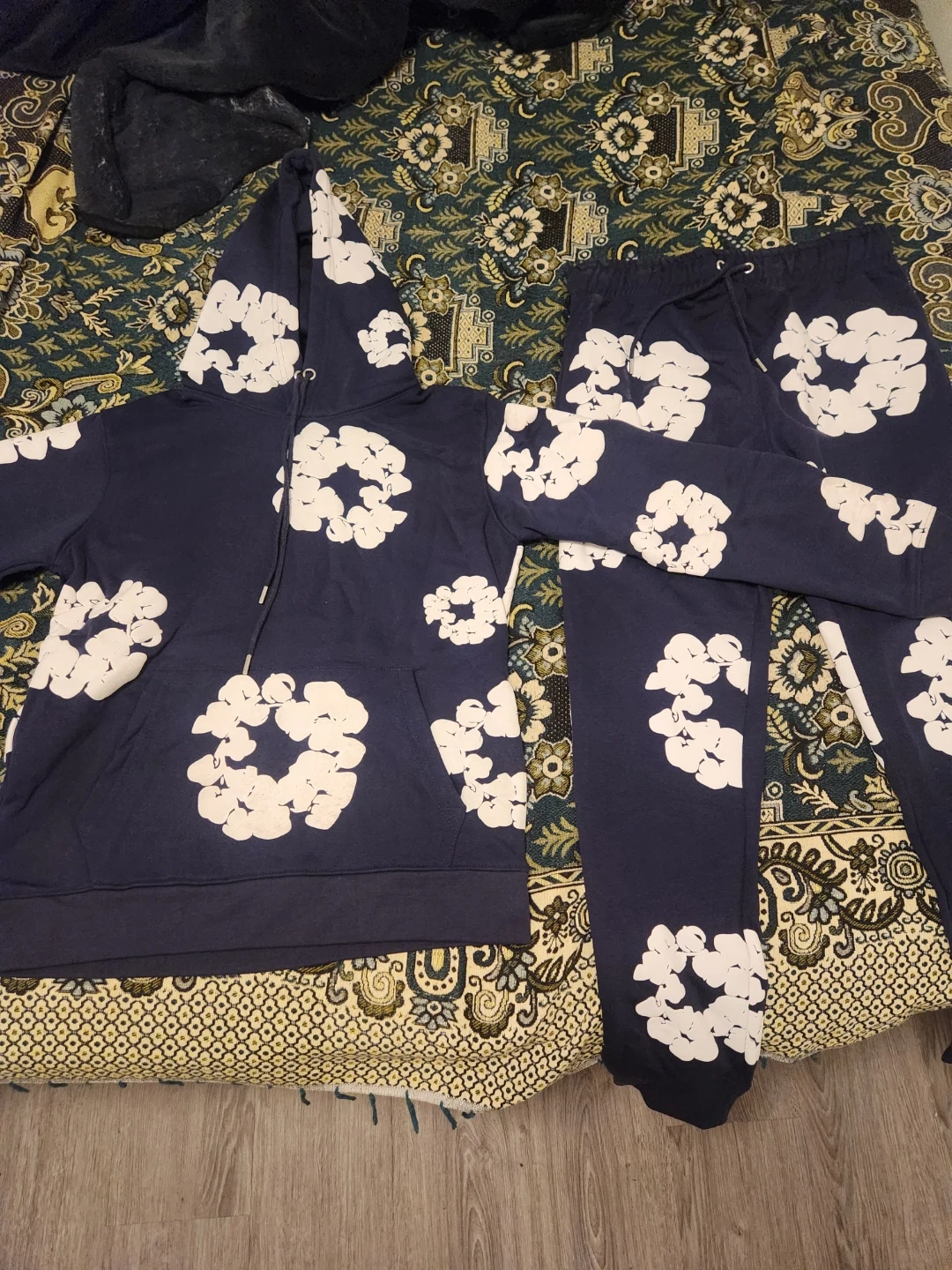 This is a navy blue hoodie and sweatpants set from Denim Tears. It features a white floral pattern all over the garments. The set is made in Portugal. Made for comfy streetwear!