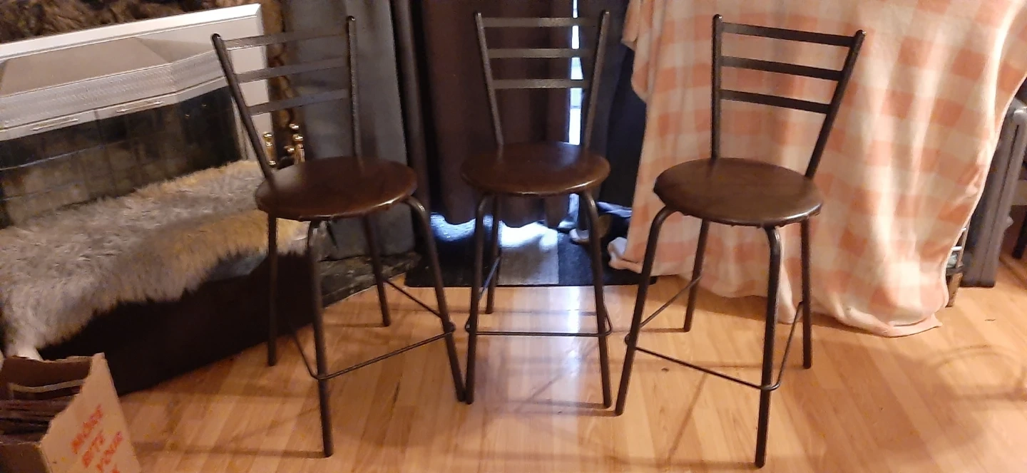 Selling a set of three Nordesign counter height stools (26") with brown faux leather seats and dark metal frames. Overall dimensions are 16 X 18 X 38. These are in like new condition and ready to go. Similar stools are easily selling between $75-100 each. Priced for a quick sale at $66 for all three. Yes it's available if you see the ad up. FCFS. No holds or E-Transfers. Cash only. Will deliver for an extra $10.