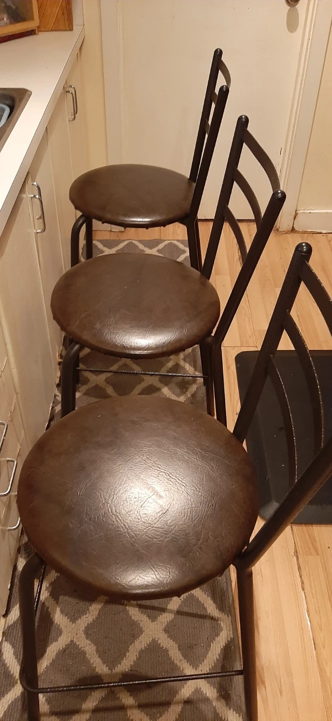 Selling a set of three Nordesign counter height stools (26") with brown faux leather seats and dark metal frames. Overall dimensions are 16 X 18 X 38. These are in like new condition and ready to go. Similar stools are easily selling between $75-100 each. Priced for a quick sale at $66 for all three. Yes it's available if you see the ad up. FCFS. No holds or E-Transfers. Cash only. Will deliver for an extra $10.