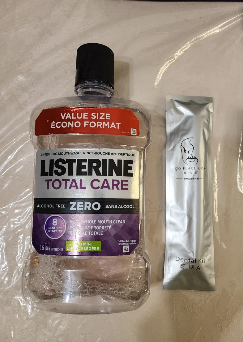 Listerine mouthwash in Cool Mint flavour, 1/4 fool. Plus a sealed dental kit with a toothbrush.