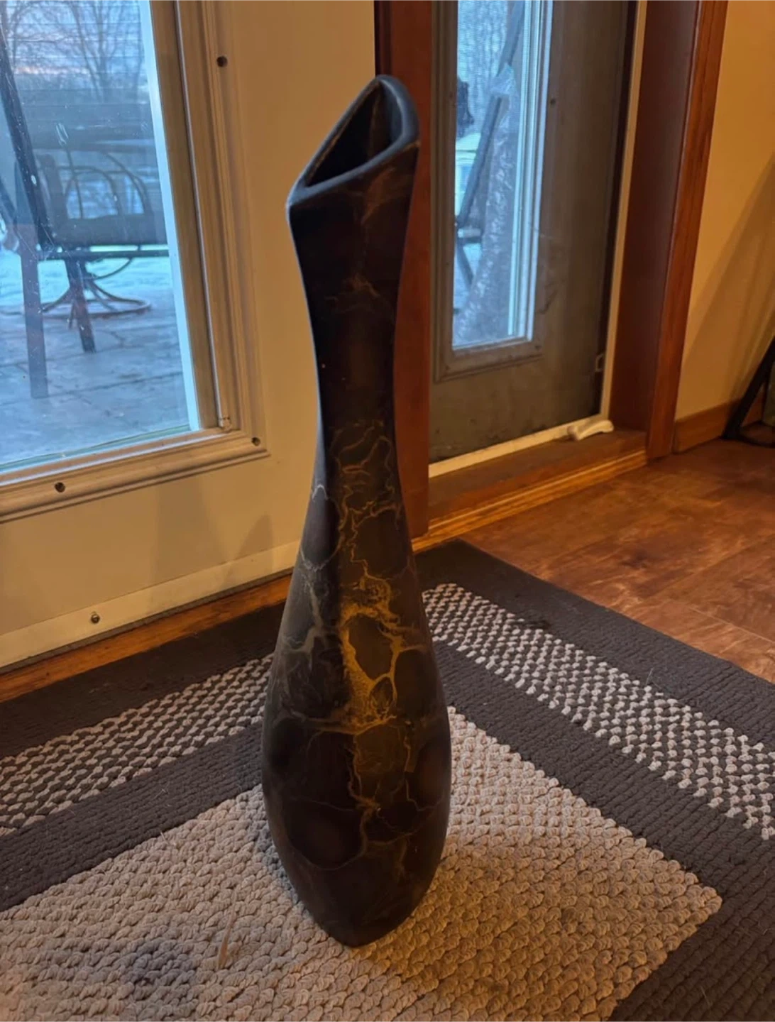 This is a tall, decorative vase with a unique marbled pattern. It has a dark brown and gold finish. It's suitable for display on its own or with dried floral arrangements.
