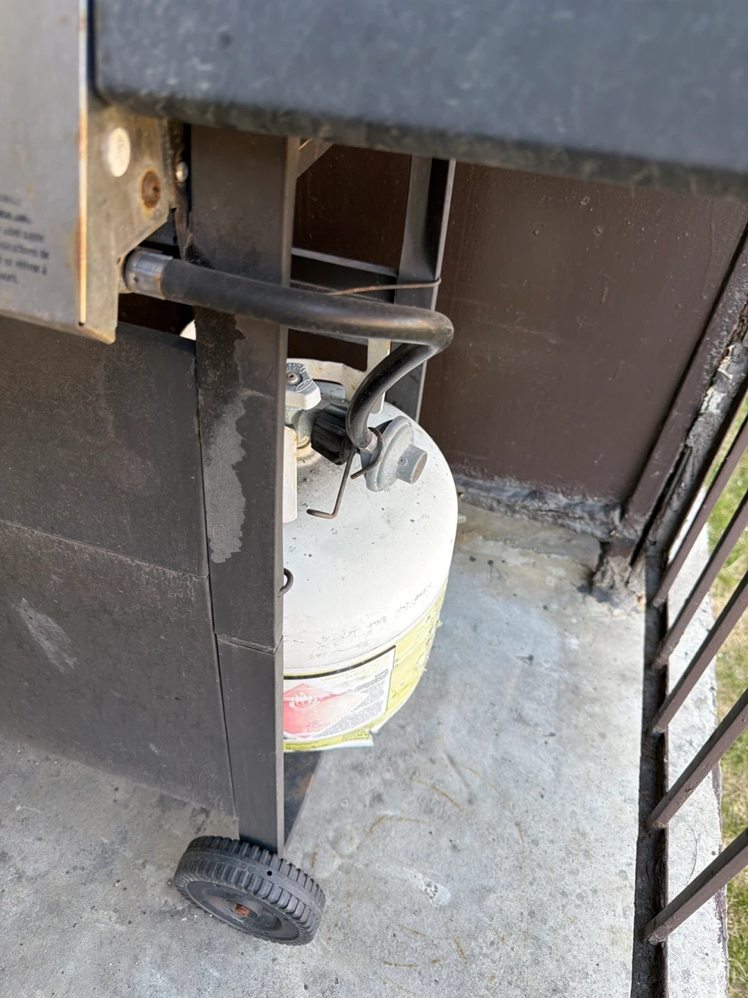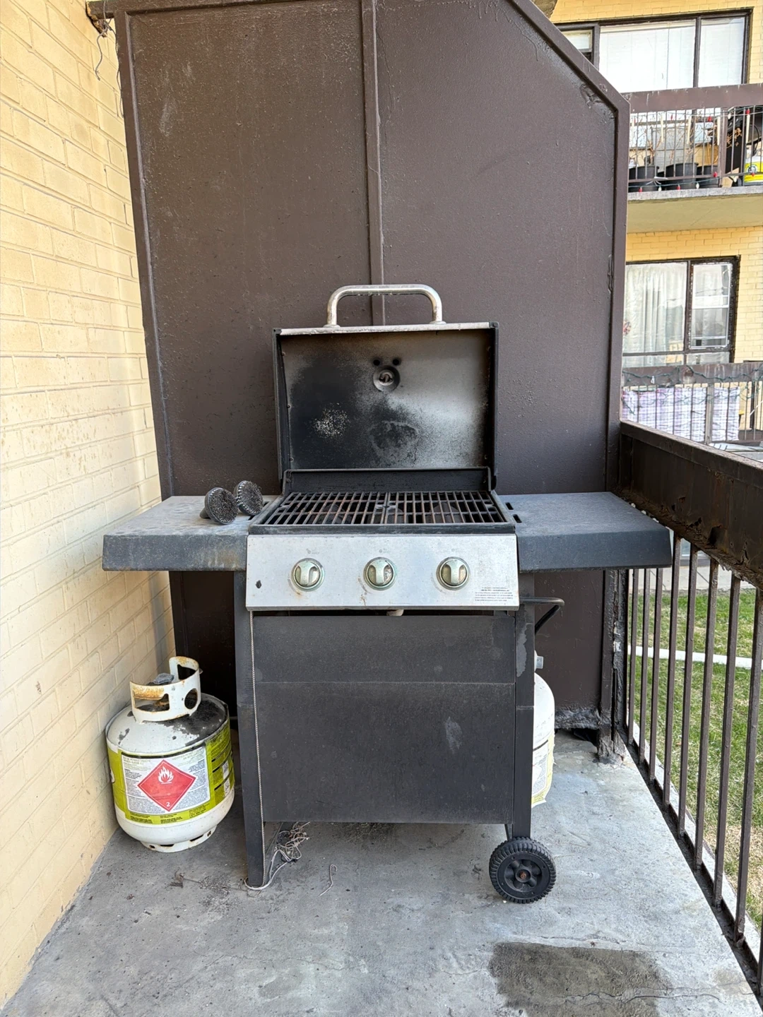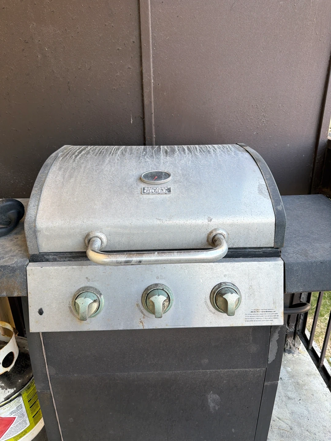 Kenmore 3-burner propane grill. Includes a propane tank and a grill brush. It has three burners for versatile cooking. Great for backyard BBQs! You can have both propane tanks. I’m unsure if there’s any propane left in the one on the ground but there should be some left in the one attached to the bbq