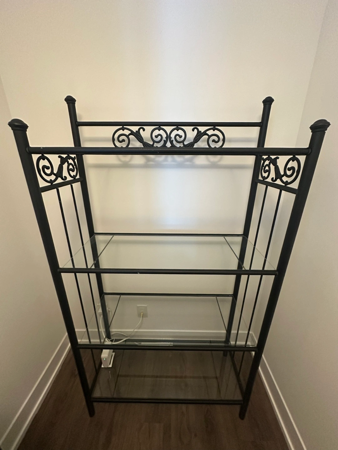 Four-shelf storage unit. Black metal frame. Glass shelves. Ornate detailing. Good for various uses, great for starting seedlings. Slight imperfection on the top bar from paint.