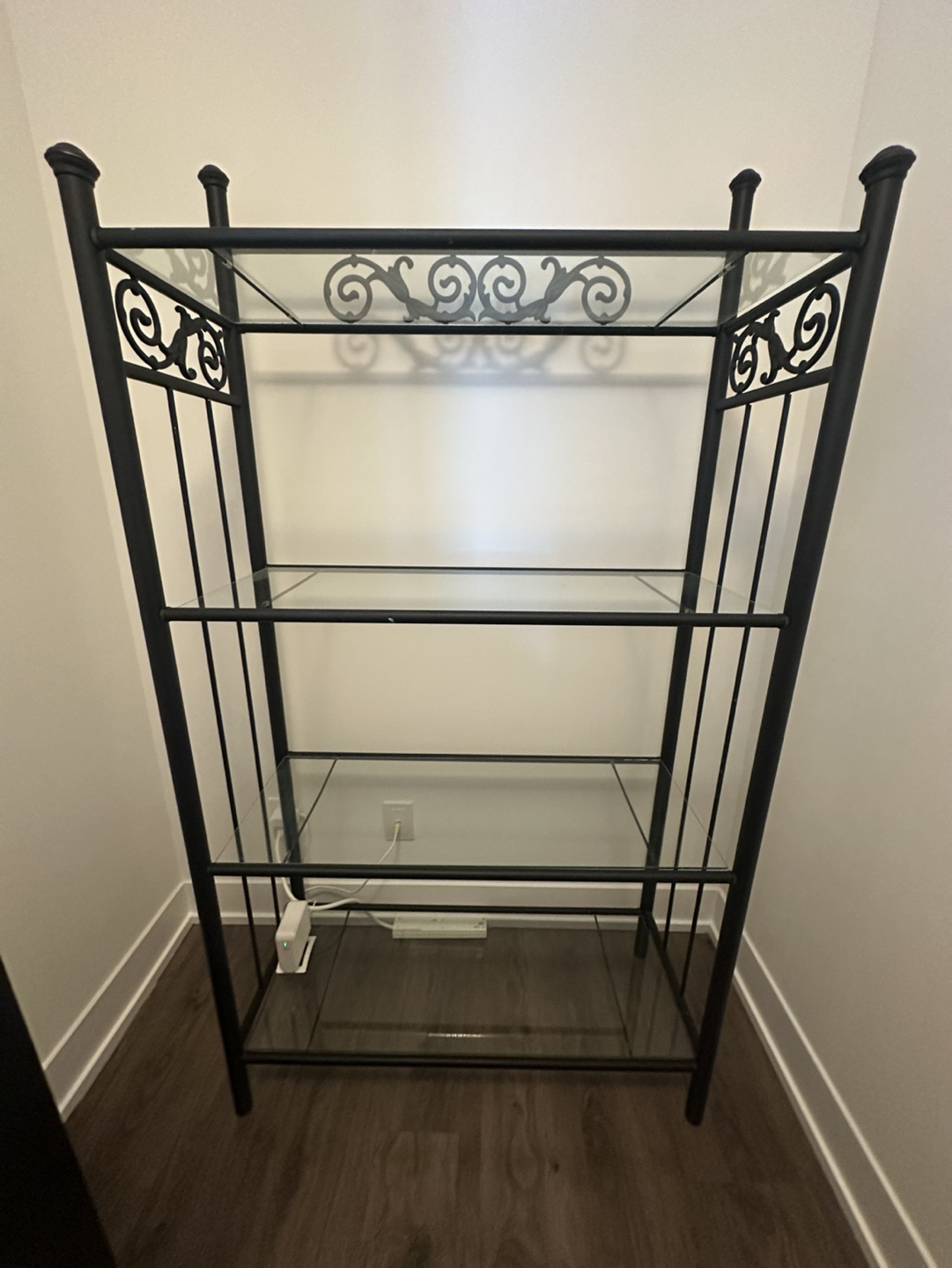 Four-shelf storage unit. Black metal frame. Glass shelves. Ornate detailing. Good for various uses, great for starting seedlings. Slight imperfection on the top bar from paint.